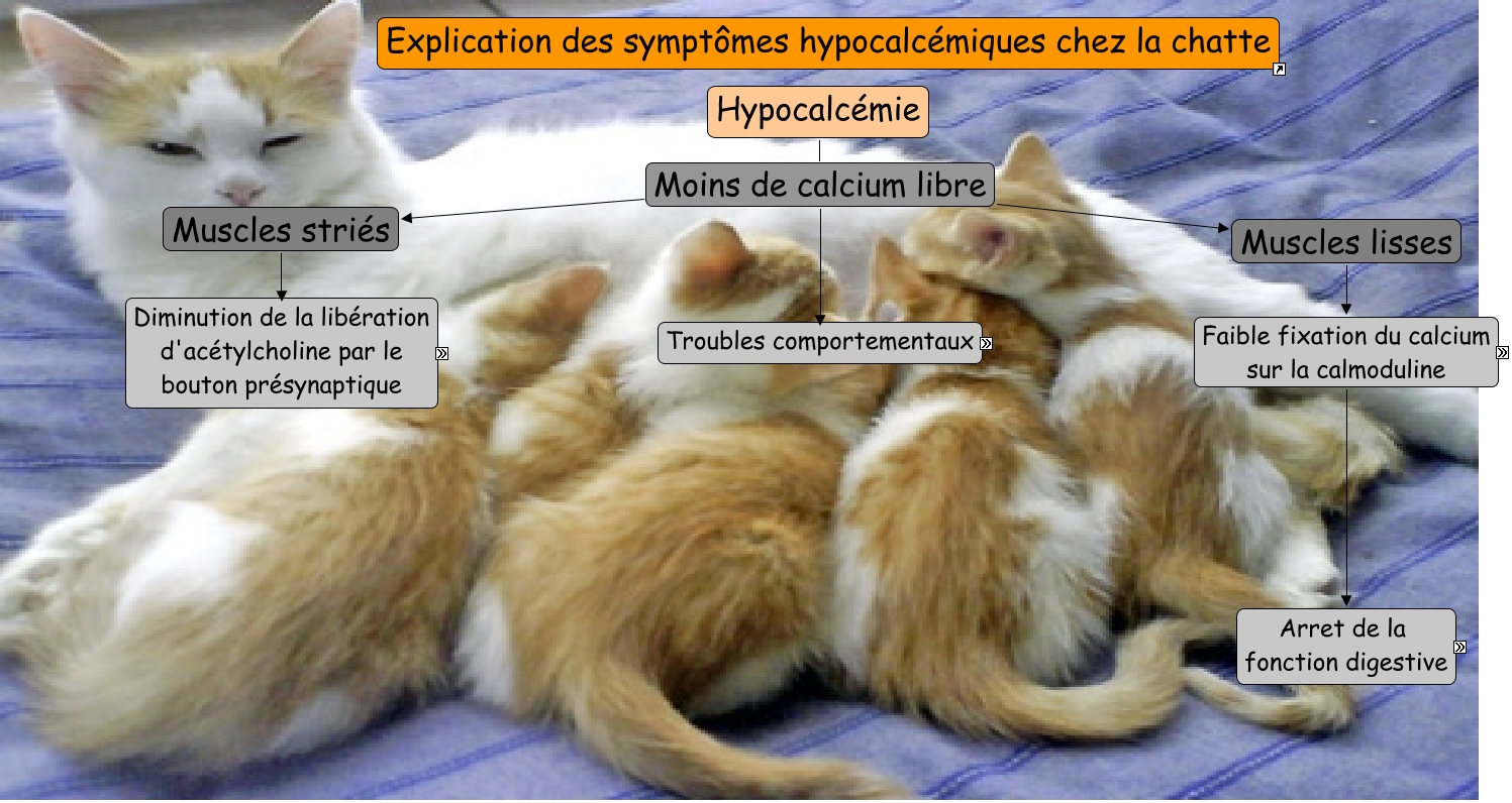 Cette carte de concepts créée avec IHMC CmapTools traite de: symptômes chatte, Muscles striés Diminution de la libération d'acétylcholine par le bouton présynaptique, Moins de calcium libre Muscles striés, Diminution du tonus musculaire Tremblements, faible fixation du calcium sur la calmoduline myosine kinase peu activée, Diminution de la libération d'acétylcholine par le bouton présynaptique Diminution du tonus musculaire, chaine régulatrice de myosine peu phosphorylée contractions musculaires faibles, Hypocalcémie Moins de calcium libre, Troubles comportementaux Hyperexcitabilité, Arret de la fonction digestive Hypothermie, Diminution du tonus musculaire Paralysie flasque, Paralysie flasque Hypothermie, Moins de calcium libre Muscles lisses, Stase alimentaire Accumulation des aliments dans l'estomacs, Arret de la fonction digestive Vomissements, myosine kinase peu activée chaine régulatrice de myosine peu phosphorylée, Troubles comportementaux Hypersensibilité, Arret de la fonction digestive Anorexie, Moins de calcium libre Troubles comportementaux, Faible fixation du calcium sur la calmoduline Arret de la fonction digestive, Muscles lisses Faible fixation du calcium sur la calmoduline