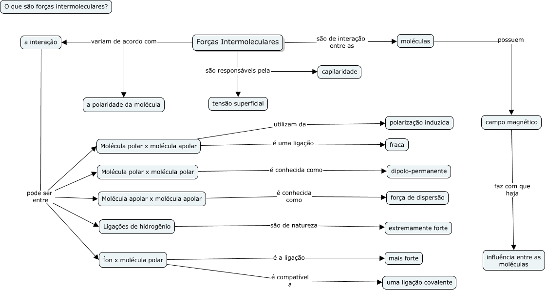 Esse mapa conceitual, produzido no IHMC CmapTools, tem a informação relacionada a: Forças Intermoleculares - Fernanda, Forças Intermoleculares são responsáveis pela capilaridade, Ligações de hidrogênio são de natureza extremamente forte, Forças Intermoleculares variam de acordo com a polaridade da molécula, a interação pode ser entre Ligações de hidrogênio, a interação pode ser entre Molécula apolar x molécula apolar, campo magnético faz com que haja influência entre as moléculas, Molécula polar x molécula polar é conhecida como dipolo-permanente, Íon x molécula polar é compatível a uma ligação covalente, Molécula polar x molécula apolar utilizam da polarização induzida, a interação pode ser entre Molécula polar x molécula apolar, Íon x molécula polar é a ligação mais forte, Molécula apolar x molécula apolar é conhecida como força de dispersão, Forças Intermoleculares variam de acordo com a interação, Forças Intermoleculares são de interação entre as moléculas, a interação pode ser entre Molécula polar x molécula polar, moléculas possuem campo magnético, a interação pode ser entre Íon x molécula polar, Molécula polar x molécula apolar é uma ligação fraca, Forças Intermoleculares são responsáveis pela tensão superficial