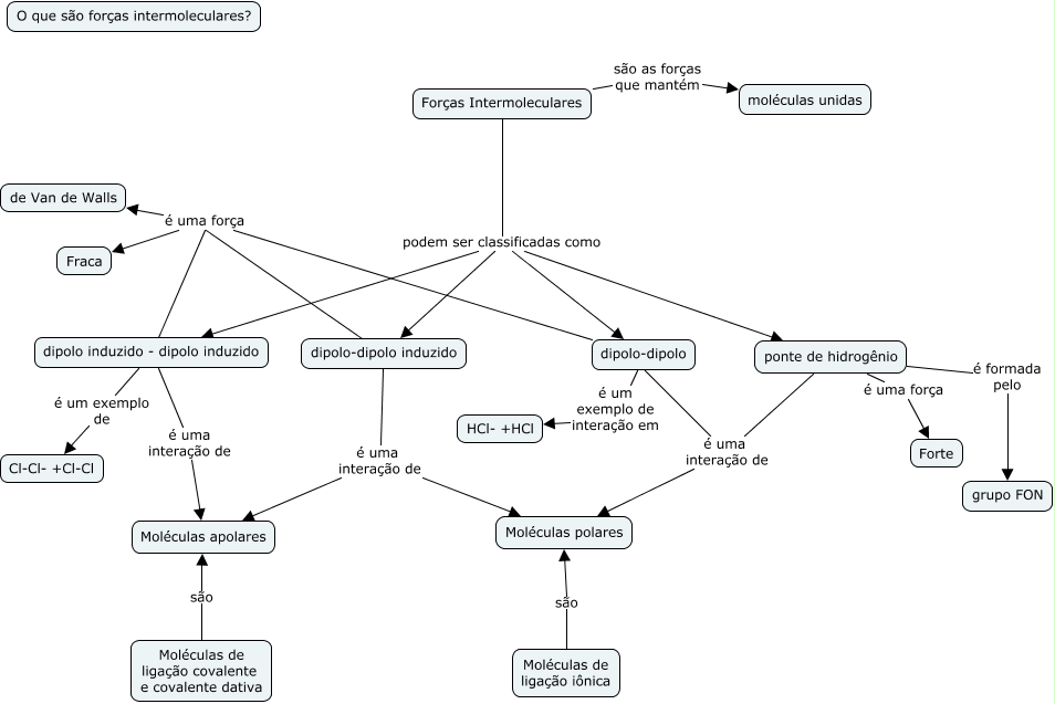 Esse mapa conceitual, produzido no IHMC CmapTools, tem a informação relacionada a: Forças intermoleculares - Gilmar, ponte de hidrogênio é formada pelo grupo FON, Forças Intermoleculares podem ser classificadas como dipolo-dipolo induzido, dipolo-dipolo induzido é uma interação de Moléculas polares, dipolo induzido - dipolo induzido é uma força de Van de Walls, dipolo-dipolo é um exemplo de interação em HCl- +HCl, Moléculas de ligação covalente e covalente dativa são Moléculas apolares, dipolo induzido - dipolo induzido é uma interação de Moléculas apolares, dipolo-dipolo induzido é uma força Fraca, dipolo-dipolo é uma força Fraca, Moléculas de ligação iônica são Moléculas polares, dipolo induzido - dipolo induzido é uma força Fraca, Forças Intermoleculares podem ser classificadas como dipolo-dipolo, dipolo-dipolo induzido é uma força de Van de Walls, Forças Intermoleculares são as forças que mantém moléculas unidas, Forças Intermoleculares podem ser classificadas como dipolo induzido - dipolo induzido, Forças Intermoleculares podem ser classificadas como ponte de hidrogênio, dipolo-dipolo é uma força de Van de Walls, dipolo-dipolo é uma interação de Moléculas polares, ponte de hidrogênio é uma interação de Moléculas polares, ponte de hidrogênio é uma força Forte