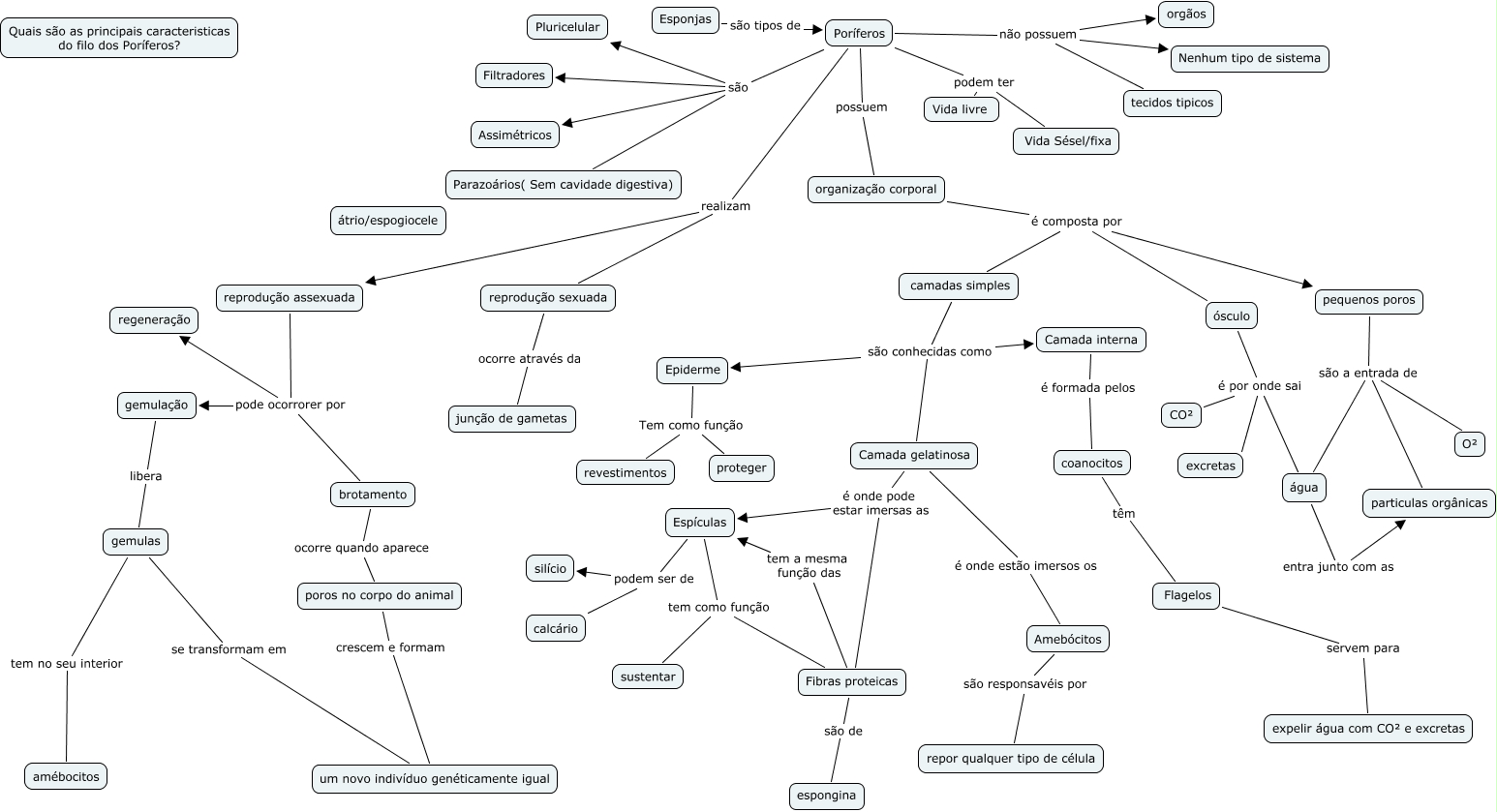 Esse mapa conceitual, produzido no IHMC CmapTools, tem a informação relacionada a: Reino Políferos, ósculo é por onde sai CO², Fibras proteicas são de espongina, camadas simples são conhecidas como Epiderme, Poríferos são Pluricelular, Poríferos não possuem tecidos tipicos, Poríferos podem ter Vida livre, Camada gelatinosa é onde estão imersos os Amebócitos, camadas simples são conhecidas como Camada gelatinosa, Espículas tem como função sustentar, organização corporal é composta por ósculo, Poríferos realizam reprodução assexuada, Camada interna é formada pelos coanocitos, Epiderme Tem como função proteger, organização corporal é composta por pequenos poros, Poríferos possuem organização corporal, ósculo é por onde sai excretas, coanocitos têm Flagelos, Amebócitos são responsavéis por repor qualquer tipo de célula, camadas simples são conhecidas como Camada interna, Poríferos não possuem Nenhum tipo de sistema