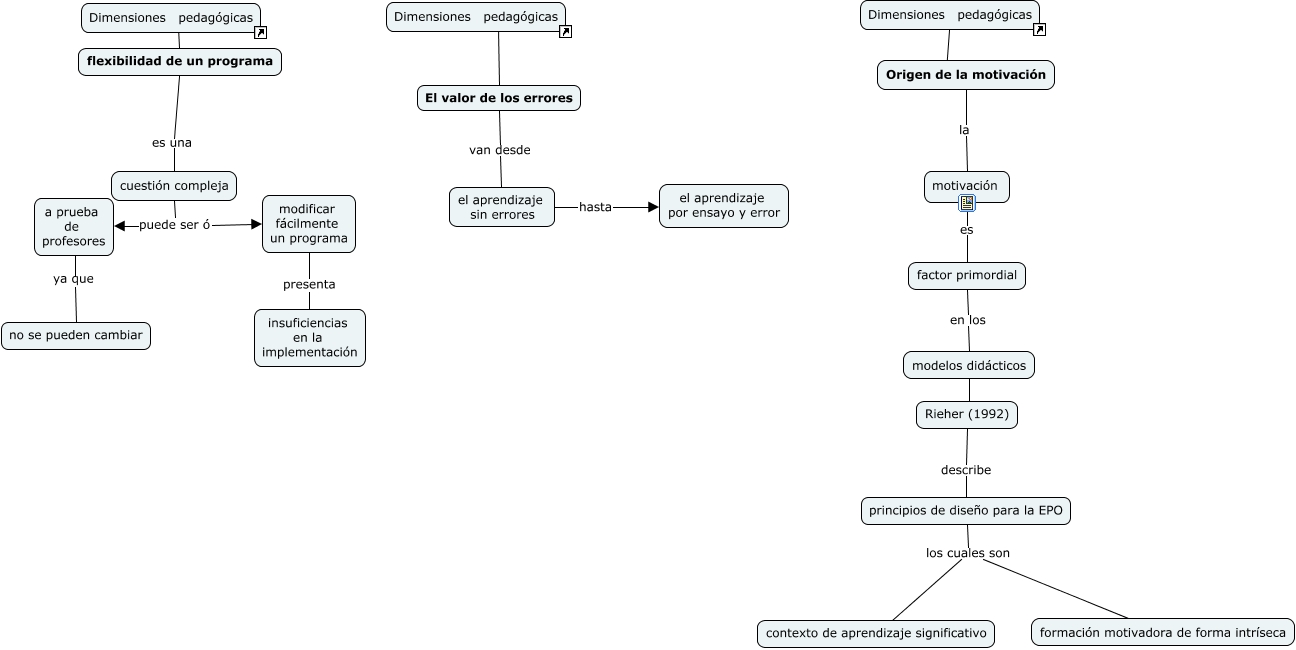 Este Cmap, tiene información relacionada con: T8, el aprendizaje sin errores hasta el aprendizaje por ensayo y error, El valor de los errores van desde el aprendizaje sin errores, Rieher (1992) describe principios de diseño para la EPO, a prueba de profesores ya que no se pueden cambiar, motivación es factor primordial, Origen de la motivación la motivación, principios de diseño para la EPO los cuales son contexto de aprendizaje significativo, factor primordial en los modelos didácticos, modelos didácticos ???? Rieher (1992), principios de diseño para la EPO los cuales son formación motivadora de forma intríseca, Dimensiones pedagógicas ???? flexibilidad de un programa, flexibilidad de un programa es una cuestión compleja, cuestión compleja puede ser ó modificar fácilmente un programa, cuestión compleja puede ser ó a prueba de profesores, Dimensiones pedagógicas ???? El valor de los errores, modificar fácilmente un programa presenta insuficiencias en la implementación, Dimensiones pedagógicas ???? Origen de la motivación
