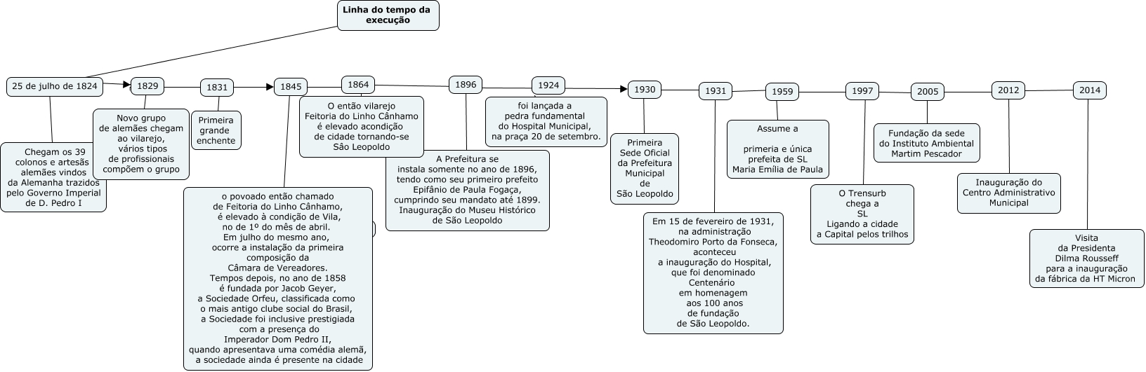 Esse mapa conceitual, produzido no IHMC CmapTools, tem a informação relacionada a: LINHA DO TEMPO, 1930 ???? Primeira Sede Oficial da Prefeitura Municipal de São Leopoldo, 1924 foi lançada a pedra fundamental do Hospital Municipal, na praça 20 de setembro., 1959 ???? Assume a primeria e única prefeita de SL Maria Emília de Paula, 1845 ???? o povoado então chamado de Feitoria do Linho Cânhamo, é elevado à condição de Vila, no de 1º do mês de abril. Em julho do mesmo ano, ocorre a instalação da primeira composição da Câmara de Vereadores. Tempos depois, no ano de 1858 é fundada por Jacob Geyer, a Sociedade Orfeu, classificada como o mais antigo clube social do Brasil, a Sociedade foi inclusive prestigiada com a presença do Imperador Dom Pedro II, quando apresentava uma comédia alemã, a sociedade ainda é presente na cidade, 2012 ???? 2014, O então vilarejo Feitoria do Linho Cânhamo é elevado acondição de cidade tornando-se Sâo Leopoldo ???? 1864, 1831 ???? Primeira grande enchente, 1896 ???? 1930, 25 de julho de 1824 ???? Chegam os 39 colonos e artesãs alemães vindos da Alemanha trazidos pelo Governo Imperial de D. Pedro I, Linha do tempo da execução ???? 25 de julho de 1824, 1959 ???? 1997, 1829 ???? Novo grupo de alemães chegam ao vilarejo, vários tipos de profissionais compõem o grupo, 2012 ???? Inauguração do Centro Administrativo Municipal, 25 de julho de 1824 ???? 1829, 2005 ???? Fundação da sede do Instituto Ambiental Martim Pescador, 1896 ???? A Prefeitura se instala somente no ano de 1896, tendo como seu primeiro prefeito Epifânio de Paula Fogaça, cumprindo seu mandato até 1899. Inauguração do Museu Histórico de São Leopoldo, 1864 ???? 1896, 1997 ???? O Trensurb chega a SL Ligando a cidade a Capital pelos trilhos, 1829 ???? 1845, 2014 ???? Visita da Presidenta Dilma Rousseff para a inauguração da fábrica da HT Micron