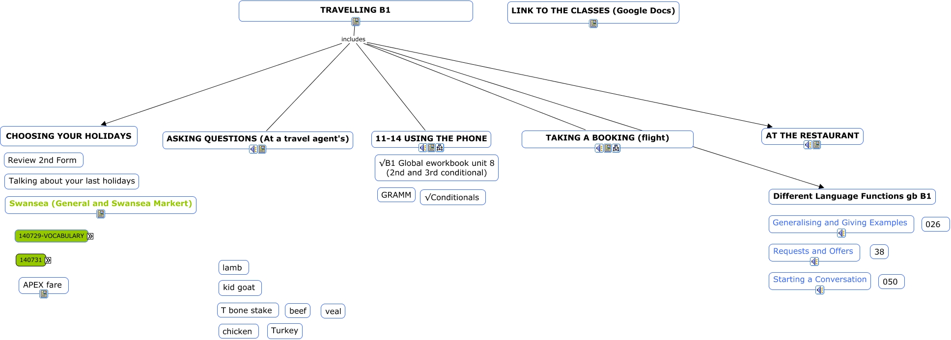 This Concept Map, created with IHMC CmapTools, has information related to: 140801-ST-WELCOME, TRAVEL & TOURISM, TRAVELLING B1 includes Different Language Functions gb B1, usa say a round trip, TRAVELLING B1 includes ASKING QUESTIONS (At a travel agent's), TRAVELLING B1 includes TAKING A BOOKING (flight), TRAVELLING B1 includes CHOOSING YOUR HOLIDAYS, usa say one way ticket, TRAVELLING B1 includes 11-14 USING THE PHONE, TRAVELLING B1 includes AT THE RESTAURANT
