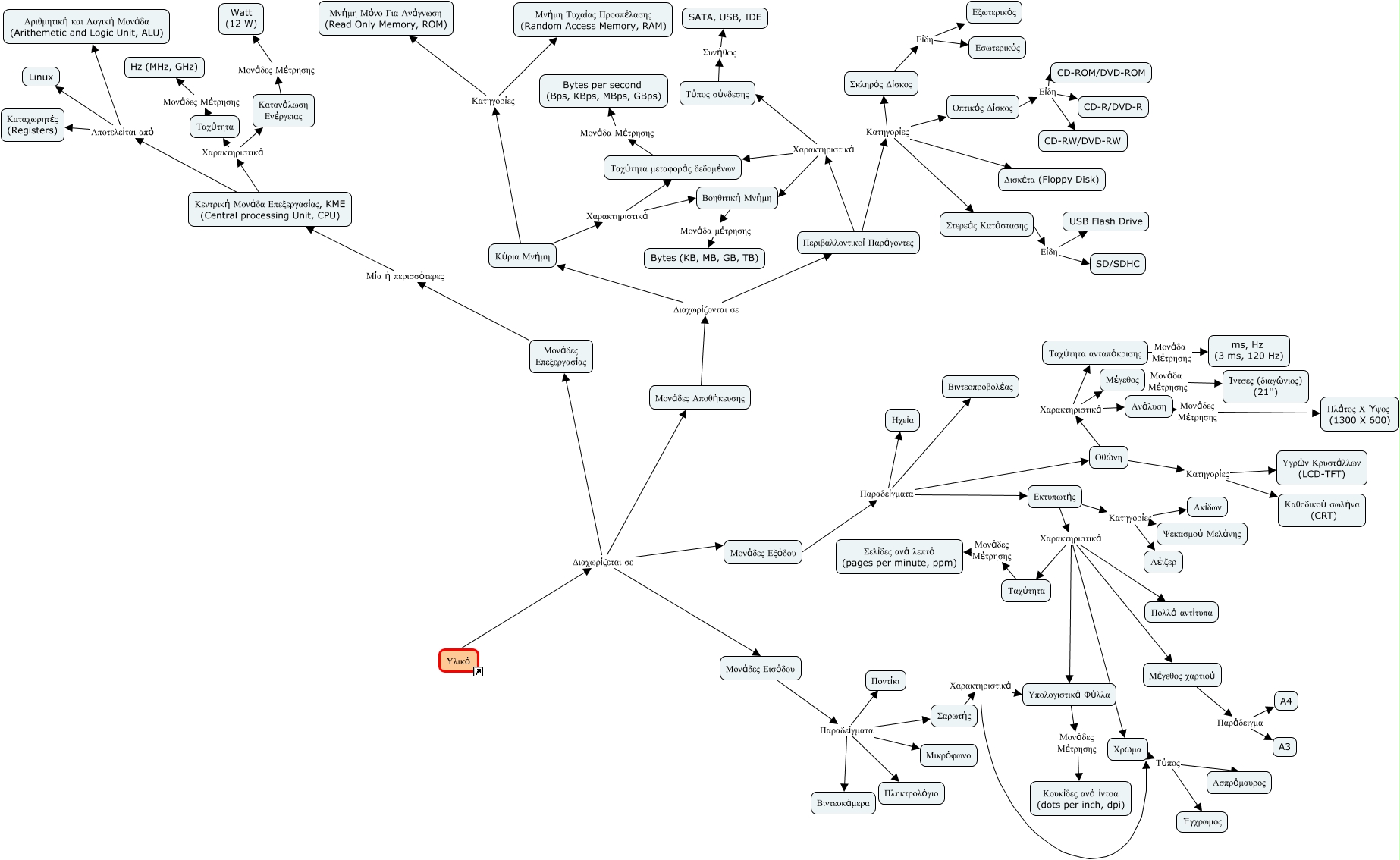 This Concept Map, created with IHMC CmapTools, has information related to: hardware, Κεντρική Μονάδα Επεξεργασίας, KME (Central processing Unit, CPU) Αποτελείται από Καταχωρητές (Registers), Ανάλυση Μονάδες Μέτρησης Πλάτος Χ Ύψος (1300 X 600), Κύρια Μνήμη Κατηγορίες Μνήμη Τυχαίας Προσπέλασης (Random Access Memory, RAM), Κύρια Μνήμη Χαρακτηριστικά Βοηθιτική Μνήμη, Σαρωτής Χαρακτηριστικά Χρώμα, Στερεάς Κατάστασης Είδη SD/SDHC, Ταχύτητα μεταφοράς δεδομένων Μονάδα Μέτρησης Bytes per second (Bps, KBps, MBps, GBps), Ταχύτητα Μονάδες Μέτρησης Hz (MHz, GHz), Μονάδες Επεξεργασίας Μία ή περισσότερες Κεντρική Μονάδα Επεξεργασίας, KME (Central processing Unit, CPU), Βοηθιτική Μνήμη Μονάδα μέτρησης Bytes (KB, MB, GB, TB), Υλικό Διαχωρίζεται σε Μονάδες Εισόδου, Εκτυπωτής Χαρακτηριστικά Πολλά αντίτυπα, Στερεάς Κατάστασης Είδη USB Flash Drive, Τύπος σύνδεσης Συνήθως SATA, USB, IDE, Υλικό Διαχωρίζεται σε Μονάδες Εξόδου, Χρώμα Τύπος Έγχρωμος, Μονάδες Αποθήκευσης Διαχωρίζονται σε Περιβαλλοντικοί Παράγοντες, Ταχύτητα ανταπόκρισης Μονάδα Μέτρησης ms, Hz (3 ms, 120 Hz), Οπτικός Δίσκος Είδη CD-RW/DVD-RW, Οθώνη Χαρακτηριστικά Μέγεθος