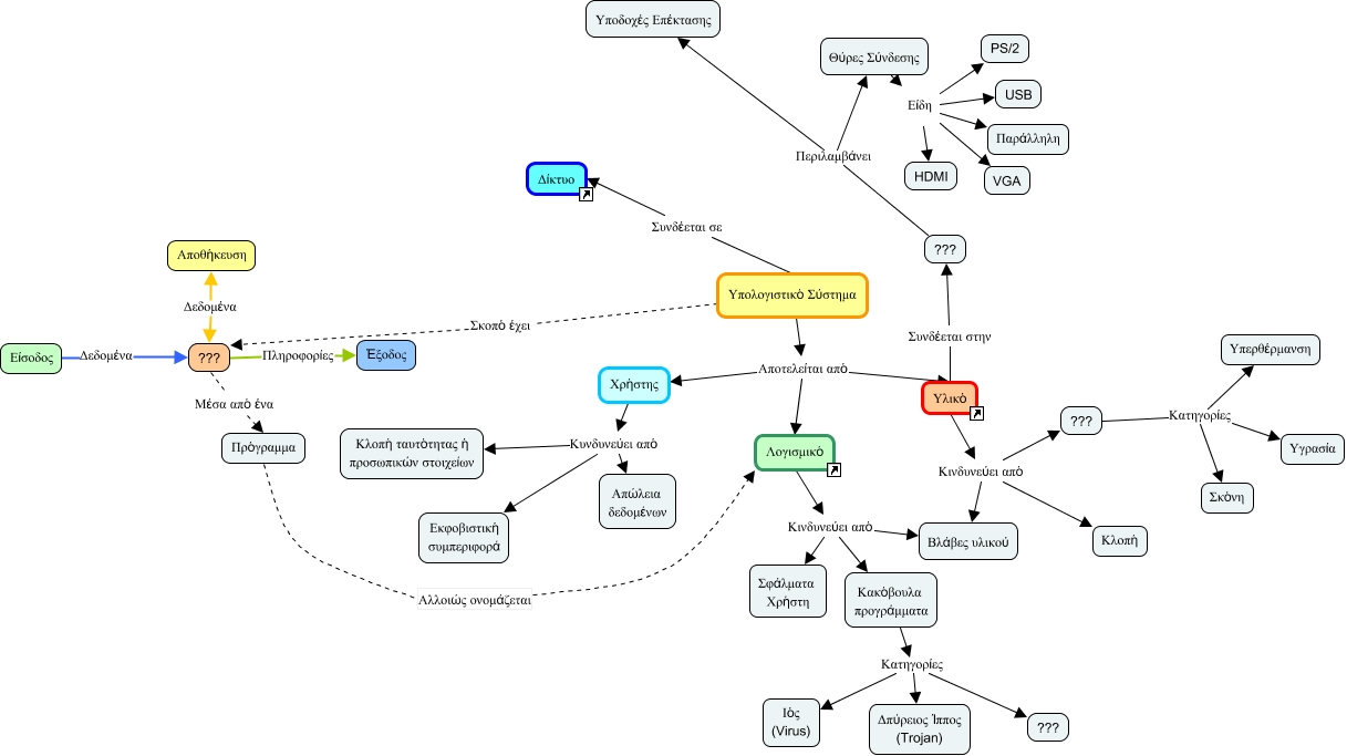 This Concept Map, created with IHMC CmapTools, has information related to: main, Υπολογιστικ�? Σ�?στημα Σκοπ�? έχει ???, �?ακ�?βουλα π�?ογ�?άμματα �?ατηγο�?ίες Ι�?ς (Virus), Υπολογιστικ�? Σ�?στημα Συνδέεται σε Δίκτυο, ??? �?ατηγο�?ίες Σκ�?νη, �?�?�?ες Σ�?νδεσης Είδη HDMI, Υπολογιστικ�? Σ�?στημα Αποτελείται απ�? Λογισμικ�?, ??? Πε�?ιλαμβάνει Υποδοχές Επέκτασης, Χ�?ήστης �?υνδυνε�?ει απ�? �?λοπή ταυτ�?τητας ή π�?οσωπικ�?ν στοιχείων, Υπολογιστικ�? Σ�?στημα Αποτελείται απ�? Υλικ�?, ??? �?ατηγο�?ίες Υπε�?θέ�?μανση, �?�?�?ες Σ�?νδεσης Είδη USB, Υλικ�? �?ινδυνε�?ει απ�? �?λοπή, ??? �?έσα απ�? ένα Π�?�?γ�?αμμα, �?ακ�?βουλα π�?ογ�?άμματα �?ατηγο�?ίες ???, Υπολογιστικ�? Σ�?στημα Αποτελείται απ�? Χ�?ήστης, ??? �?ατηγο�?ίες Υγ�?ασία, �?ακ�?βουλα π�?ογ�?άμματα �?ατηγο�?ίες Δπ�?�?ειος �?ππος (Trojan), Υλικ�? �?ινδυνε�?ει απ�? Βλάβες υλικο�?, Λογισμικ�? �?ινδυνε�?ει απ�? Σφάλματα Χ�?ήστη, �?�?�?ες Σ�?νδεσης Είδη VGA