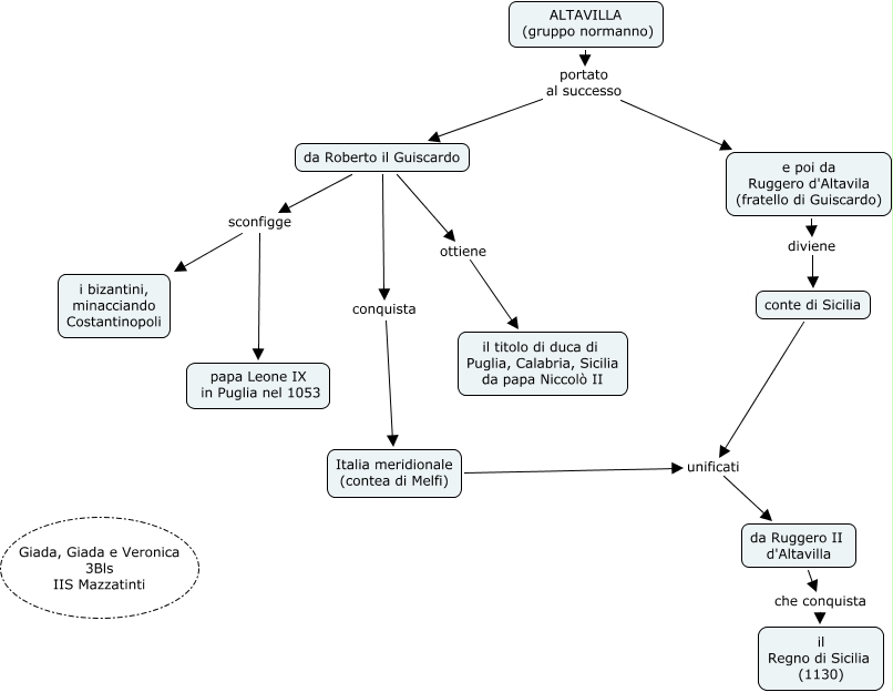 Questa Cmap, creata con IHMC CmapTools, contiene informazioni relative a: normanni giada giada e veronica 3bls, ALTAVILLA (gruppo normanno) portato al successo e poi da Ruggero d'Altavila (fratello di Guiscardo), conte di Sicilia unificati da Ruggero II d'Altavilla, Italia meridionale (contea di Melfi) unificati da Ruggero II d'Altavilla, da Roberto il Guiscardo ottiene il titolo di duca di Puglia, Calabria, Sicilia da papa Niccolò II, da Ruggero II d'Altavilla che conquista il Regno di Sicilia (1130), da Roberto il Guiscardo sconfigge papa Leone IX in Puglia nel 1053, da Roberto il Guiscardo sconfigge i bizantini, minacciando Costantinopoli, da Roberto il Guiscardo conquista Italia meridionale (contea di Melfi), e poi da Ruggero d'Altavila (fratello di Guiscardo) diviene conte di Sicilia, ALTAVILLA (gruppo normanno) portato al successo da Roberto il Guiscardo