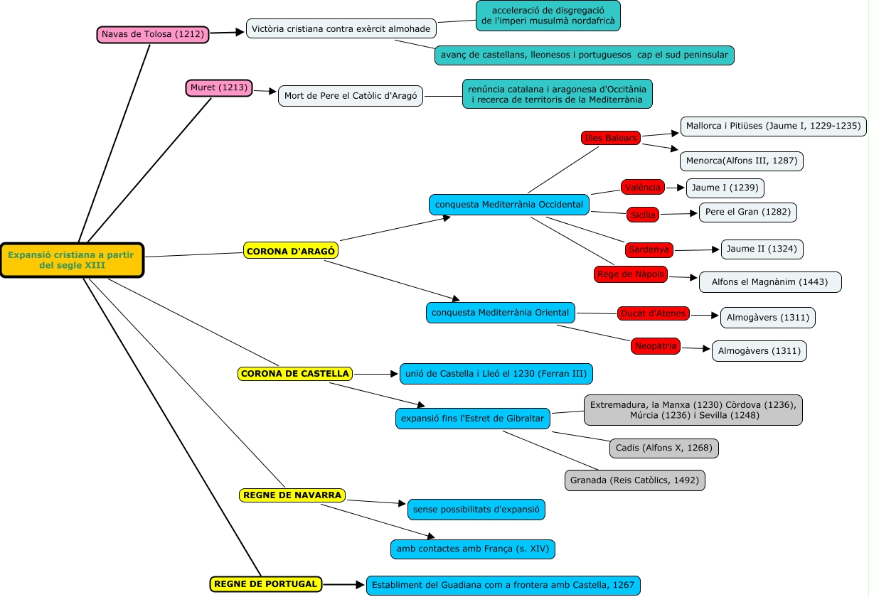 Este Cmap, tiene información relacionada con: expansió cristiana segle XIII, Victòria cristiana contra exèrcit almohade ???? acceleració de disgregació de l'imperi musulmà nordafricà, Expansió cristiana a partir del segle XIII CORONA D'ARAGÓ conquesta Mediterrània Occidental, expansió fins l'Estret de Gibraltar ???? Cadis (Alfons X, 1268), conquesta Mediterrània Occidental Sicília Pere el Gran (1282), Expansió cristiana a partir del segle XIII REGNE DE PORTUGAL Establiment del Guadiana com a frontera amb Castella, 1267, conquesta Mediterrània Occidental Rege de Nàpols Alfons el Magnànim (1443), Expansió cristiana a partir del segle XIII CORONA DE CASTELLA expansió fins l'Estret de Gibraltar, Expansió cristiana a partir del segle XIII REGNE DE NAVARRA amb contactes amb França (s. XIV), conquesta Mediterrània Occidental Illes Balears Mallorca i Pitiüses (Jaume I, 1229-1235), conquesta Mediterrània Occidental Illes Balears Menorca(Alfons III, 1287), expansió fins l'Estret de Gibraltar ???? Granada (Reis Catòlics, 1492), Expansió cristiana a partir del segle XIII Muret (1213) Mort de Pere el Catòlic d'Aragó, conquesta Mediterrània Oriental Neopàtria Almogàvers (1311), conquesta Mediterrània Oriental Ducat d'Atenes Almogàvers (1311), Victòria cristiana contra exèrcit almohade ???? avanç de castellans, lleonesos i portuguesos cap el sud peninsular, conquesta Mediterrània Occidental Sardenya Jaume II (1324), Expansió cristiana a partir del segle XIII CORONA D'ARAGÓ conquesta Mediterrània Oriental, Expansió cristiana a partir del segle XIII Navas de Tolosa (1212) Victòria cristiana contra exèrcit almohade, Expansió cristiana a partir del segle XIII REGNE DE NAVARRA sense possibilitats d'expansió, Mort de Pere el Catòlic d'Aragó ???? renúncia catalana i aragonesa d'Occitània i recerca de territoris de la Mediterrània