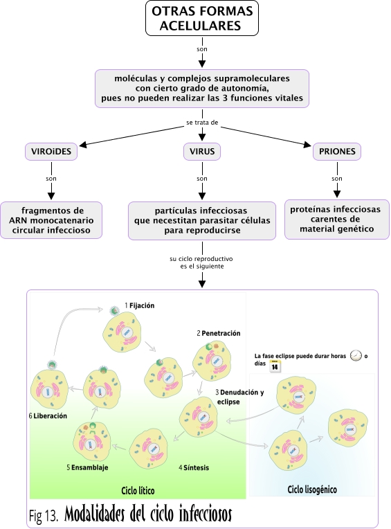 Este Cmap, tiene información relacionada con: 6.11 Otras formas de vida, PRIONES son proteínas infecciosas carentes de material genético, moléculas y complejos supramoleculares con cierto grado de autonomía, pues no pueden realizar las 3 funciones vitales se trata de VIRUS, moléculas y complejos supramoleculares con cierto grado de autonomía, pues no pueden realizar las 3 funciones vitales se trata de PRIONES, VIRUS son partículas infecciosas que necestitan parasitar células para reproducirse, VIROiDES son fragmentos de ARN monocatenario circular infeccioso, OTRAS FORMAS ACELULARES son moléculas y complejos supramoleculares con cierto grado de autonomía, pues no pueden realizar las 3 funciones vitales, moléculas y complejos supramoleculares con cierto grado de autonomía, pues no pueden realizar las 3 funciones vitales se trata de VIROiDES, partículas infecciosas que necestitan parasitar células para reproducirse su ciclo reproductivo es el siguiente