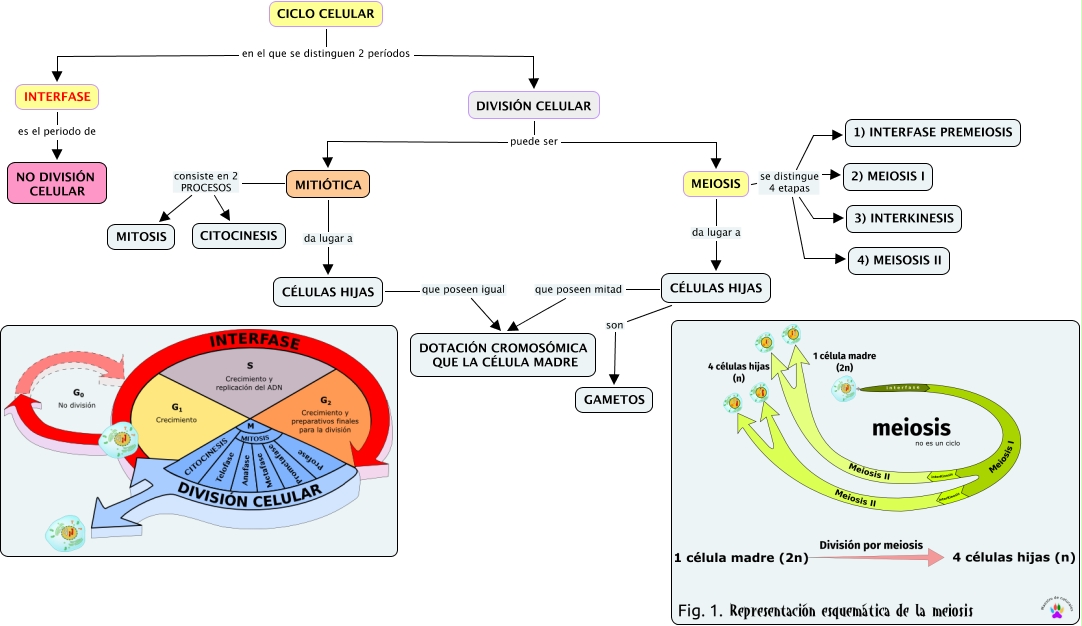 Este Cmap, tiene información relacionada con: 6.14 El ciclo celular, MEIOSIS da lugar a CÉLULAS HIJAS, CÉLULAS HIJAS son GAMETOS, MEIOSIS se distingue 4 etapas 3) INTERKINESIS, CICLO CELULAR en el que se distinguen 2 períodos INTERFASE, INTERFASE es el periodo de NO DIVISIÓN CELULAR, MITIÓTICA consiste en 2 PROCESOS MITOSIS, CÉLULAS HIJAS que poseen mitad DOTACIÓN CROMOSÓMICA QUE LA CÉLULA MADRE, MITIÓTICA da lugar a CÉLULAS HIJAS, CICLO CELULAR en el que se distinguen 2 períodos DIVISIÓN CELULAR, MITIÓTICA consiste en 2 PROCESOS CITOCINESIS, CÉLULAS HIJAS que poseen igual DOTACIÓN CROMOSÓMICA QUE LA CÉLULA MADRE, DIVISIÓN CELULAR puede ser MEIOSIS, MEIOSIS se distingue 4 etapas 1) INTERFASE PREMEIOSIS, MEIOSIS se distingue 4 etapas 2) MEIOSIS I, DIVISIÓN CELULAR puede ser MITIÓTICA, MEIOSIS se distingue 4 etapas 4) MEISOSIS II
