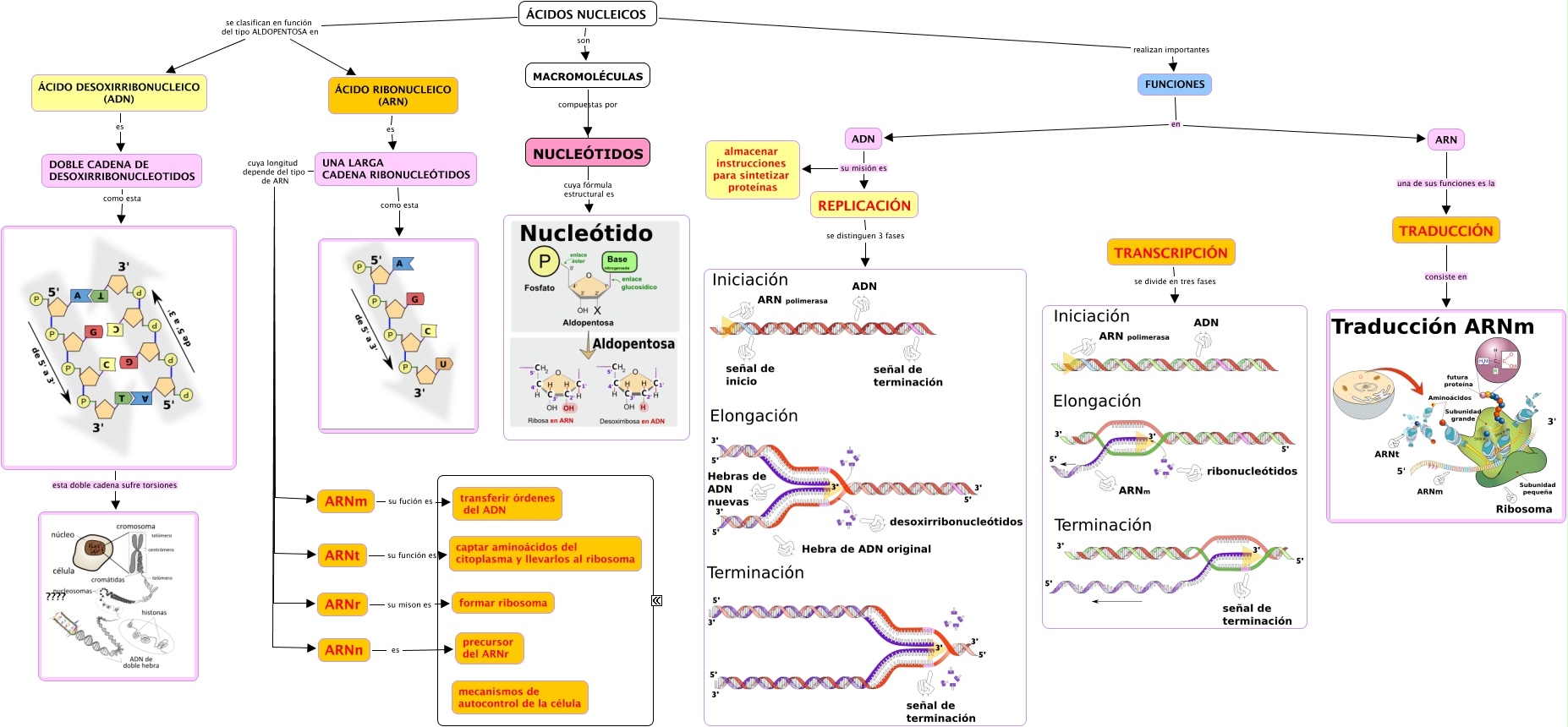 Este Cmap, tiene información relacionada con: Resumen de los Ácidos nucléicos, ARNr su mison es formar ribosoma, ÁCIDOS NUCLEICOS se clasifican en función del tipo ALDOPENTOSA en ÁCIDO RIBONUCLEICO (ARN), FUNCIONES en ADN, TRANSCRIPCIÓN se divide en tres fases, DOBLE CADENA DE DESOXIRRIBONUCLEOTIDOS como esta, ARNn es precursor del ARNr, UNA LARGA CADENA RIBONUCLEÓTIDOS cuya longitud depende del tipo de ARN ARNm, UNA LARGA CADENA RIBONUCLEÓTIDOS como esta, ÁCIDOS NUCLEICOS se clasifican en función del tipo ALDOPENTOSA en ÁCIDO DESOXIRRIBONUCLEICO (ADN), esta doble cadena sufre torsiones ????, ARNt su función es captar aminoácidos del citoplasma y llevarlos al ribosoma, MACROMOLÉCULAS cuya fórmula estructural es, ÁCIDOS NUCLEICOS son MACROMOLÉCULAS, ADN su misión es REPLICACIÓN, ÁCIDO DESOXIRRIBONUCLEICO (ADN) es DOBLE CADENA DE DESOXIRRIBONUCLEOTIDOS, FUNCIONES en ARN, MACROMOLÉCULAS compuestas por NUCLEÓTIDOS, REPLICACIÓN se distinguen 3 fases, ADN su misión es almacenar instrucciones para sintetizar proteínas, ARNm su fución es transferir órdenes del ADN