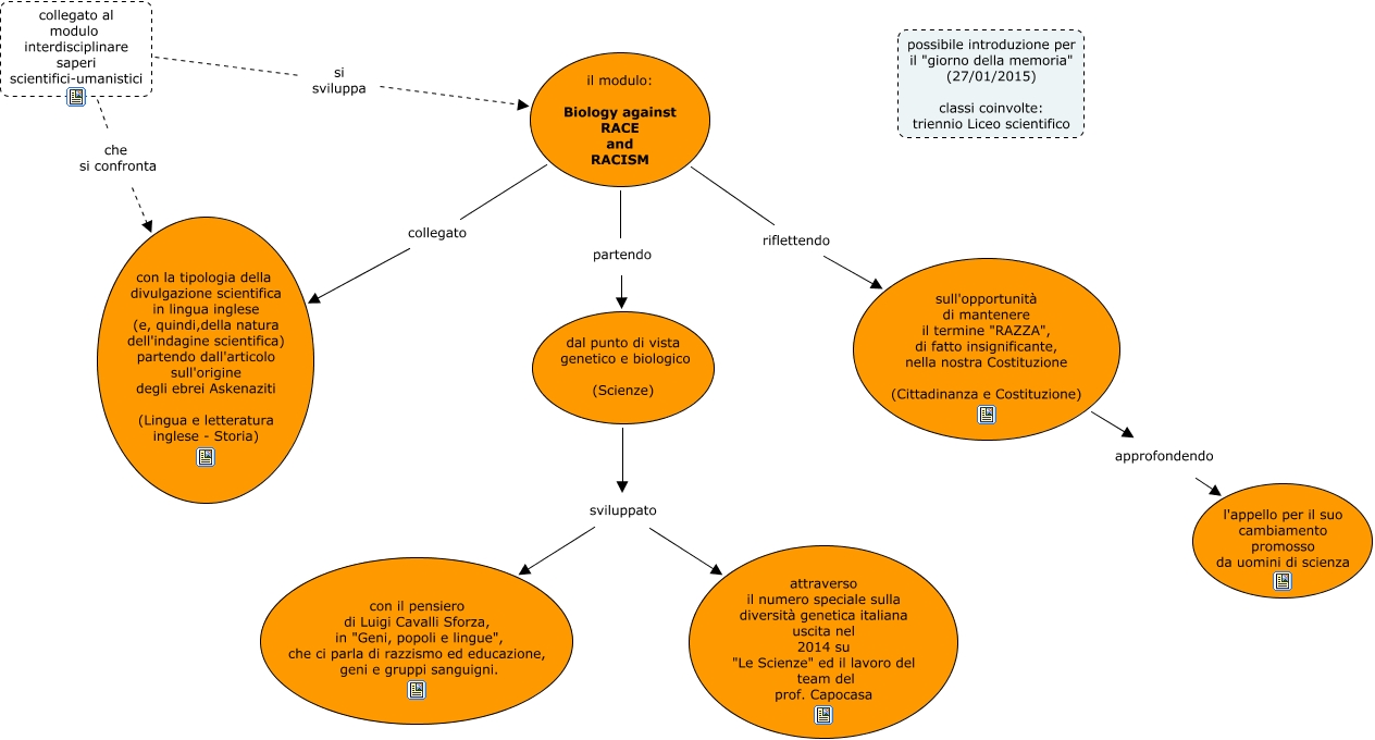 Questa Cmap, creata con IHMC CmapTools, contiene informazioni relative a: Biology against RACE and RACISM, il modulo: Biology against RACE and RACISM riflettendo sull'opportunità di mantenere il termine "RAZZA", di fatto insignificante, nella nostra Costituzione (Cittadinanza e Costituzione), il modulo: Biology against RACE and RACISM collegato con la tipologia della divulgazione scientifica in lingua inglese (e, quindi,della natura dell'indagine scientifica) partendo dall'articolo sull'origine degli ebrei Askenaziti (Lingua e letteratura inglese - Storia), collegato al modulo interdisciplinare saperi scientifici-umanistici si sviluppa il modulo: Biology against RACE and RACISM, dal punto di vista genetico e biologico (Scienze) sviluppato con il pensiero di Luigi Cavalli Sforza, in "Geni, popoli e lingue", che ci parla di razzismo ed educazione, geni e gruppi sanguigni., collegato al modulo interdisciplinare saperi scientifici-umanistici che si confronta con la tipologia della divulgazione scientifica in lingua inglese (e, quindi,della natura dell'indagine scientifica) partendo dall'articolo sull'origine degli ebrei Askenaziti (Lingua e letteratura inglese - Storia), dal punto di vista genetico e biologico (Scienze) sviluppato attraverso il numero speciale sulla diversità genetica italiana uscita nel 2014 su "Le Scienze" ed il lavoro del team del prof. Capocasa, sull'opportunità di mantenere il termine "RAZZA", di fatto insignificante, nella nostra Costituzione (Cittadinanza e Costituzione) approfondendo l'appello per il suo cambiamento promosso da uomini di scienza, il modulo: Biology against RACE and RACISM partendo dal punto di vista genetico e biologico (Scienze)