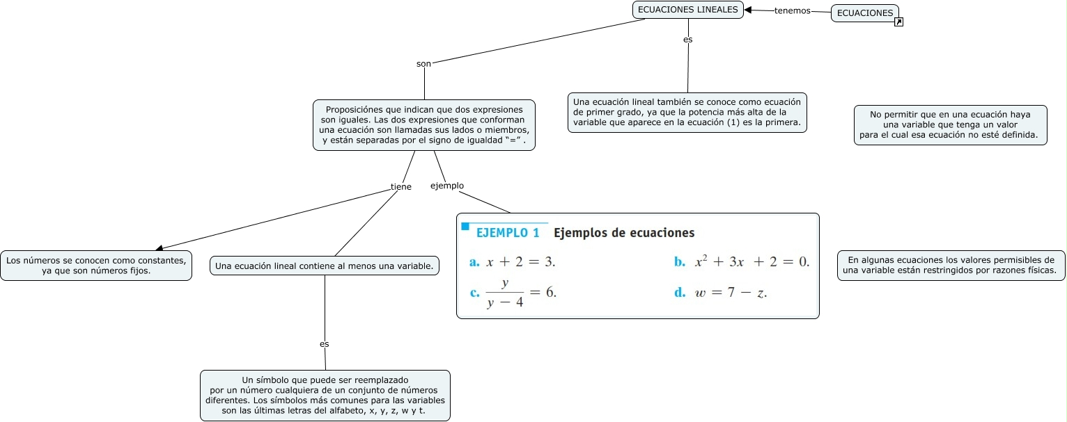 Este Cmap, tiene información relacionada con: ECUACIONES LINEALES, Proposiciónes que indican que dos expresiones son iguales. Las dos expresiones que conforman una ecuación son llamadas sus lados o miembros, y están separadas por el signo de igualdad “=” . tiene Una ecuación lineal contiene al menos una variable., Una ecuación lineal contiene al menos una variable. es Un símbolo que puede ser reemplazado por un número cualquiera de un conjunto de números diferentes. Los símbolos más comunes para las variables son las últimas letras del alfabeto, x, y, z, w y t., Proposiciónes que indican que dos expresiones son iguales. Las dos expresiones que conforman una ecuación son llamadas sus lados o miembros, y están separadas por el signo de igualdad “=” . tiene Los números se conocen como constantes, ya que son números fijos., Proposiciónes que indican que dos expresiones son iguales. Las dos expresiones que conforman una ecuación son llamadas sus lados o miembros, y están separadas por el signo de igualdad “=” . ejemplo, ECUACIONES LINEALES es Una ecuación lineal también se conoce como ecuación de primer grado, ya que la potencia más alta de la variable que aparece en la ecuación (1) es la primera., ECUACIONES LINEALES son Proposiciónes que indican que dos expresiones son iguales. Las dos expresiones que conforman una ecuación son llamadas sus lados o miembros, y están separadas por el signo de igualdad “=” ., ECUACIONES tenemos ECUACIONES LINEALES