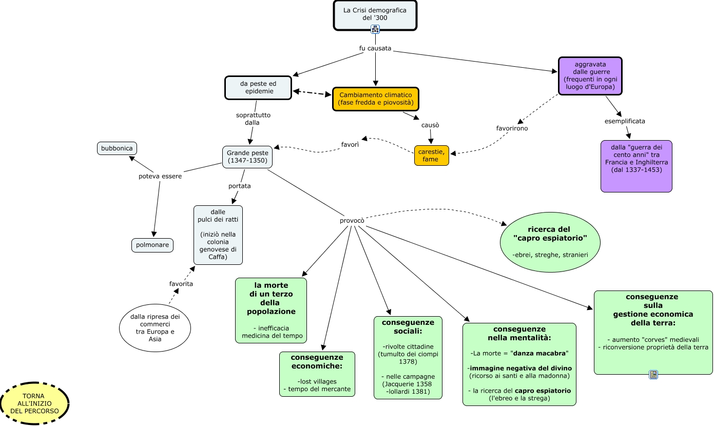Questa Cmap, creata con IHMC CmapTools, contiene informazioni relative a: crisi del 1300 2014-15, da peste ed epidemie soprattutto dalla Grande peste (1347-1350), La Crisi demografica del '300 fu causata Cambiamento climatico (fase fredda e piovosità), Grande peste (1347-1350) provocò conseguenze sociali: -rivolte cittadine (tumulto dei ciompi 1378) - nelle campagne (Jacquerie 1358 -lollardi 1381), Grande peste (1347-1350) poteva essere bubbonica, Grande peste (1347-1350) provocò conseguenze sulla gestione economica della terra: - aumento "corves" medievali - riconversione proprietà della terra, Grande peste (1347-1350) provocò conseguenze nella mentalità: -La morte = "danza macabra" -immagine negativa del divino (ricorso ai santi e alla madonna) - la ricerca del capro espiatorio (l'ebreo e la strega), La Crisi demografica del '300 fu causata aggravata dalle guerre (frequenti in ogni luogo d'Europa), aggravata dalle guerre (frequenti in ogni luogo d'Europa) esemplificata dalla "guerra dei cento anni" tra Francia e Inghilterra (dal 1337-1453), Grande peste (1347-1350) provocò la morte di un terzo della popolazione - inefficacia medicina del tempo, carestie, fame favorì Grande peste (1347-1350), aggravata dalle guerre (frequenti in ogni luogo d'Europa) favorirono carestie, fame, La Crisi demografica del '300 fu causata da peste ed epidemie, da peste ed epidemie Cambiamento climatico (fase fredda e piovosità), Grande peste (1347-1350) poteva essere polmonare, Grande peste (1347-1350) portata dalle pulci dei ratti (iniziò nella colonia genovese di Caffa), dalla ripresa dei commerci tra Europa e Asia favorita dalle pulci dei ratti (iniziò nella colonia genovese di Caffa), Grande peste (1347-1350) provocò ricerca del "capro espiatorio" -ebrei, streghe, stranieri, Cambiamento climatico (fase fredda e piovosità) causò carestie, fame, Grande peste (1347-1350) provocò conseguenze economiche: -lost villages - tempo del mercante