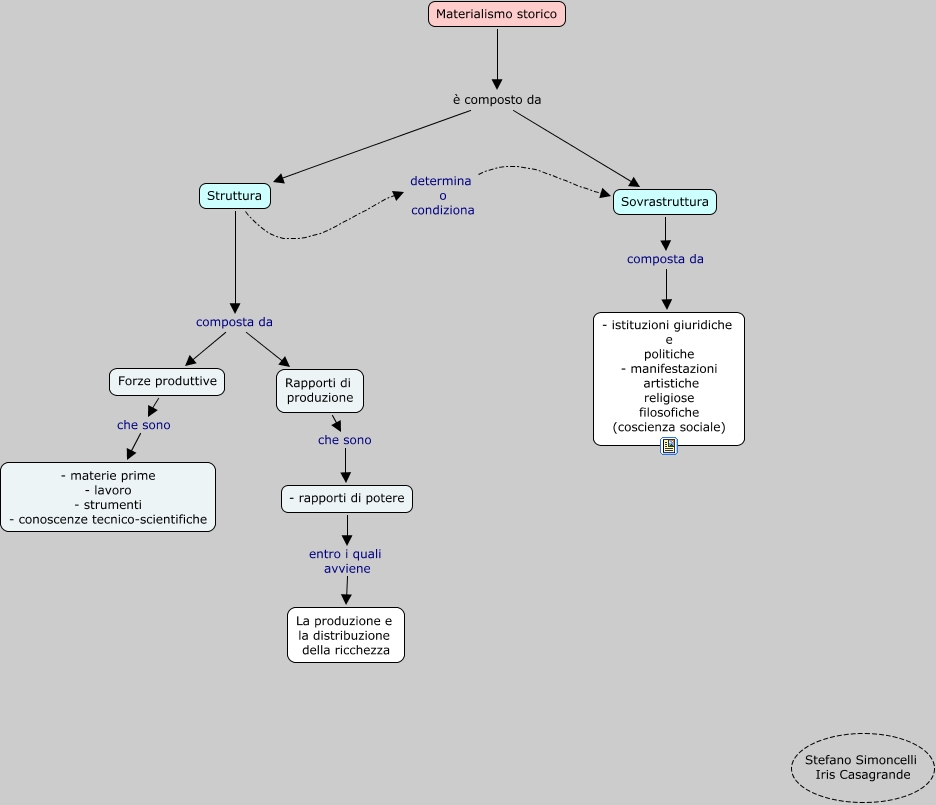 Questa Cmap, creata con IHMC CmapTools, contiene informazioni relative a: struttura marx, Rapporti di produzione che sono - rapporti di potere, Struttura composta da Forze produttive, Sovrastruttura composta da - istituzioni giuridiche e politiche - manifestazioni artistiche religiose filosofiche (coscienza sociale), Materialismo storico è composto da Struttura, Struttura determina o condiziona Sovrastruttura, Struttura composta da Rapporti di produzione, Materialismo storico è composto da Sovrastruttura, - rapporti di potere entro i quali avviene La produzione e la distribuzione della ricchezza, Forze produttive che sono - materie prime - lavoro - strumenti - conoscenze tecnico-scientifiche
