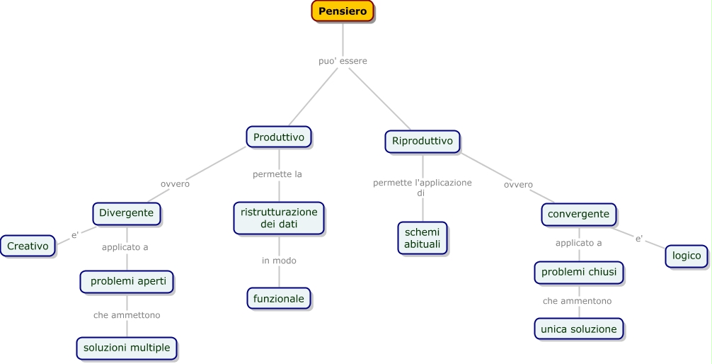 Questa Cmap, creata con IHMC CmapTools, contiene informazioni relative a: Pensiero convergente-divergente, Produttivo permette la ristrutturazione dei dati, Pensiero puo' essere Produttivo, problemi aperti che ammettono soluzioni multiple, Produttivo ovvero Divergente, Riproduttivo permette l'applicazione di schemi abituali, Riproduttivo ovvero convergente, ristrutturazione dei dati in modo funzionale, Pensiero puo' essere Riproduttivo, Divergente applicato a problemi aperti, problemi chiusi che ammentono unica soluzione, Divergente e' Creativo, convergente applicato a problemi chiusi, convergente e' logico