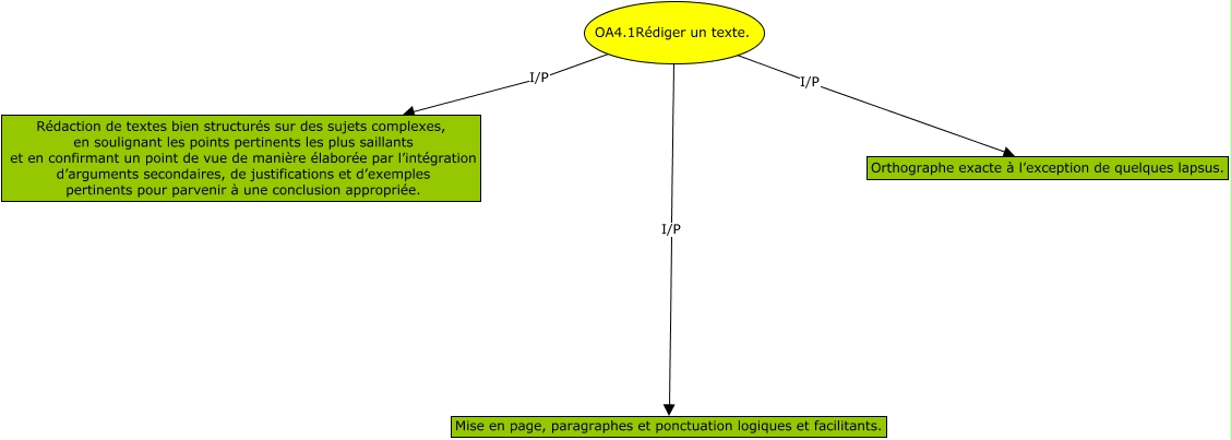 Cette carte de concepts créée avec IHMC CmapTools traite de: UA4.1, OA4.1Rédiger un texte. I/P Rédaction de textes bien structurés sur des sujets complexes, en soulignant les points pertinents les plus saillants et en confirmant un point de vue de manière élaborée par l’intégration d’arguments secondaires, de justifications et d’exemples pertinents pour parvenir à une conclusion appropriée., OA4.1Rédiger un texte. I/P Mise en page, paragraphes et ponctuation logiques et facilitants., OA4.1Rédiger un texte. I/P Orthographe exacte à l’exception de quelques lapsus.