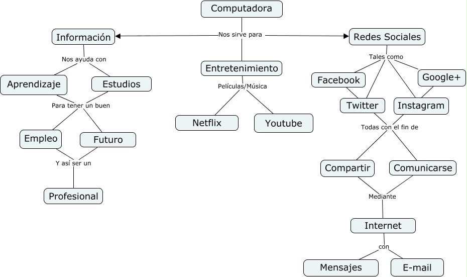 Este Cmap, tiene información relacionada con: La Computadora, Entretenimiento Películas/Música Netflix, Entretenimiento Películas/Música Youtube, Facebook Todas con el fin de Compartir, Computadora Nos sirve para Redes Sociales, Comunicarse Mediante Internet, Redes Sociales Tales como Facebook, Computadora Nos sirve para Entretenimiento, Google+ Tales como Facebook, Información Nos ayuda con Aprendizaje, Facebook Todas con el fin de Comunicarse, Google+ Todas con el fin de Compartir, Internet con E-mail, Aprendizaje Para tener un buen Futuro, Compartir Mediante Internet, Futuro Y así ser un Profesional, Información Nos ayuda con Estudios, Google+ Todas con el fin de Comunicarse, Redes Sociales Tales como Twitter, Estudios Para tener un buen Empleo, Aprendizaje Para tener un buen Empleo