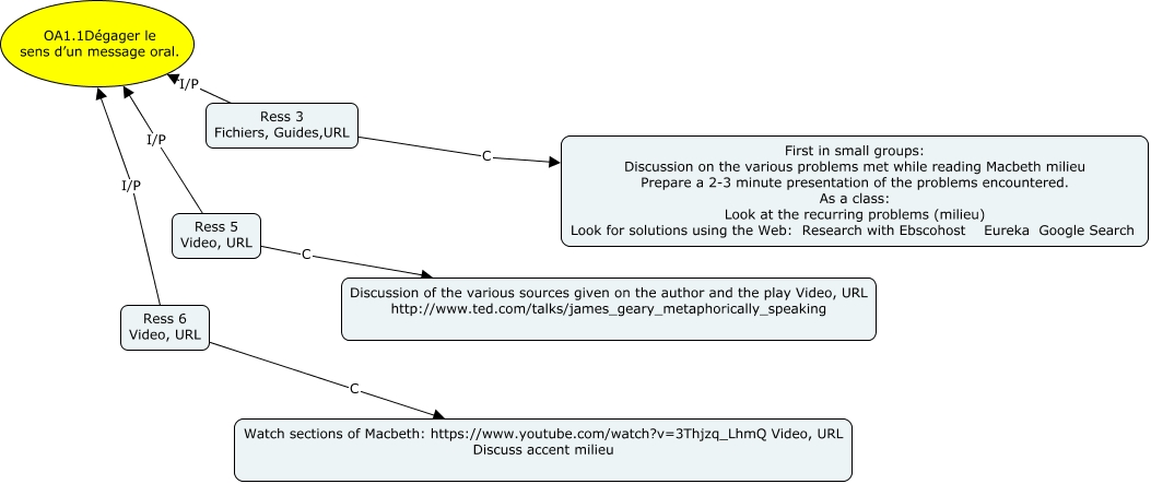 Cette carte de concepts créée avec IHMC CmapTools traite de: OA!.1 travail3, Ress 5 Video, URL C Discussion of the various sources given on the author and the play Video, URL http://www.ted.com/talks/james_geary_metaphorically_speaking, Ress 5 Video, URL I/P OA1.1Dégager le sens d’un message oral., Ress 3 Fichiers, Guides,URL I/P OA1.1Dégager le sens d’un message oral., Ress 3 Fichiers, Guides,URL C First in small groups: Discussion on the various problems met while reading Macbeth milieu Prepare a 2-3 minute presentation of the problems encountered. As a class: Look at the recurring problems (milieu) Look for solutions using the Web: Research with Ebscohost Eureka Google Search, Ress 6 Video, URL I/P OA1.1Dégager le sens d’un message oral., Ress 6 Video, URL C Watch sections of Macbeth: https://www.youtube.com/watch?v=3Thjzq_LhmQ Video, URL Discuss accent milieu