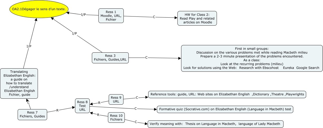Cette carte de concepts créée avec IHMC CmapTools traite de: OA2.1 travail 3, Ress 10 Fichiers C Verify meaning with: Thesis on Language in Macbeth, language of Lady Macbeth, Ress 8 Test URL C Formative quiz (Socrative.com) on Elizabethan English (Language in Macbeth) test, Ress 1 Moodle, URL, Fichier I/P OA2.1Dégager le sens d’un texte., Ress 7 Fichiers, Guides C Translating Elizabethan English: a guide on how to translate /understand Elizabethan English Fichier, guide, Ress 10 Fichiers R Ress 8 Test URL, Ress 3 Fichiers, Guides,URL C First in small groups: Discussion on the various problems met while reading Macbeth milieu Prepare a 2-3 minute presentation of the problems encountered. As a class: Look at the recurring problems (milieu) Look for solutions using the Web: Research with Ebscohost Eureka Google Search, Ress 7 Fichiers, Guides R Ress 8 Test URL, Ress 3 Fichiers, Guides,URL I/P OA2.1Dégager le sens d’un texte., Ress 9 URL R Ress 8 Test URL, Translating Elizabethan English: a guide on how to translate /understand Elizabethan English Fichier, guide I/P OA2.1Dégager le sens d’un texte., Ress 9 URL C Reference tools: guide, URL: Web sites on Elizabethan English ,Dictionary ,Theatre ,Playwrights