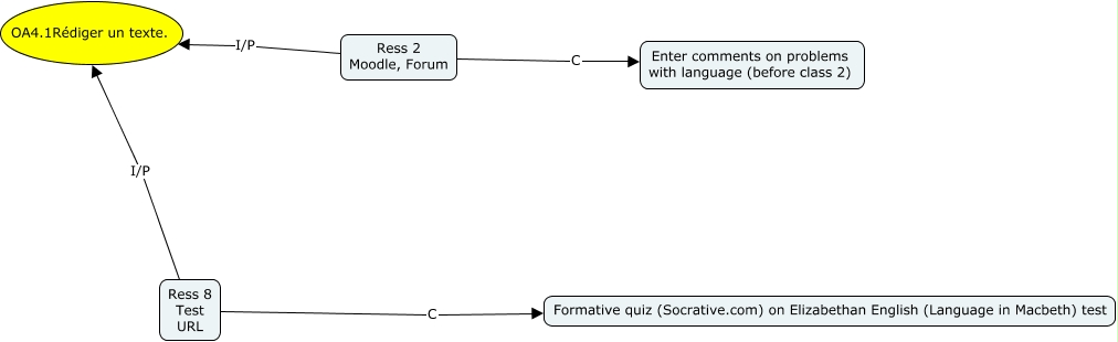 Cette carte de concepts créée avec IHMC CmapTools traite de: OA4.1 Travail 3, Ress 8 Test URL C Formative quiz (Socrative.com) on Elizabethan English (Language in Macbeth) test, Ress 2 Moodle, Forum C Enter comments on problems with language (before class 2), Ress 8 Test URL I/P OA4.1Rédiger un texte., Ress 2 Moodle, Forum I/P OA4.1Rédiger un texte.