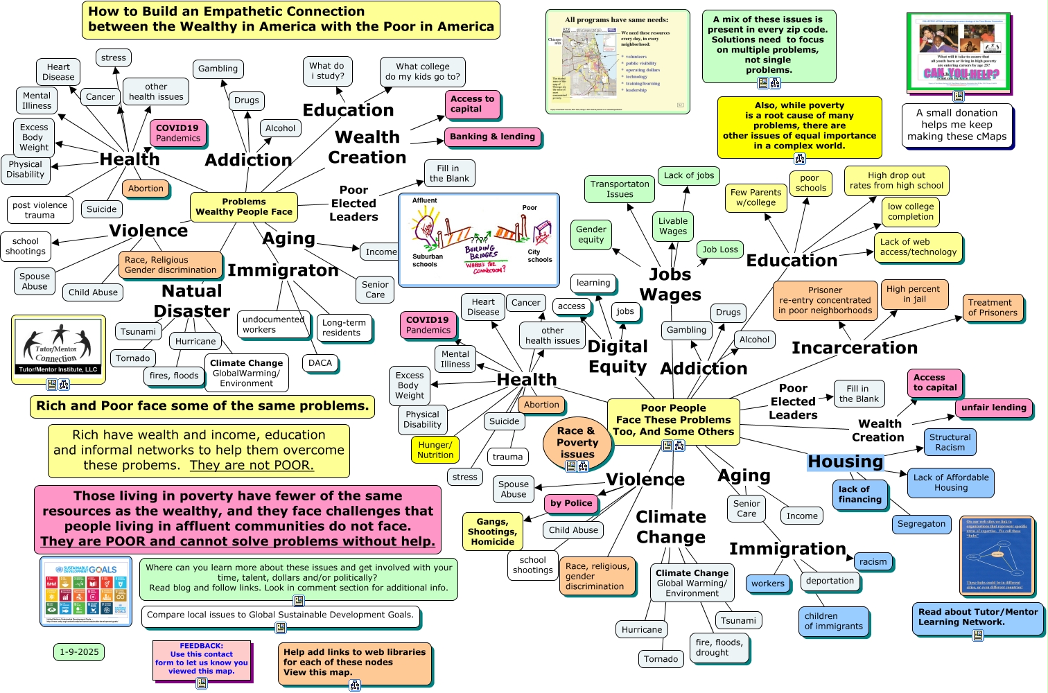 This Concept Map, created with IHMC CmapTools, has information related to: Connecting Rich and Poor in America, Poor People Face These Problems Too, And Some Others Health COVID19 Pandemics, Poor People Face These Problems Too, And Some Others Digital Equity access, Problems Wealthy People Face Health Cancer, Poor People Face These Problems Too, And Some Others Health trauma, Poor People Face These Problems Too, And Some Others Violence by Police, Poor People Face These Problems Too, And Some Others Jobs Wages Transportaton Issues, Poor People Face These Problems Too, And Some Others Education poor schools, Poor People Face These Problems Too, And Some Others Incarceration High percent in jail, Poor People Face These Problems Too, And Some Others Violence school shootings, Poor People Face These Problems Too, And Some Others Jobs Wages Lack of jobs, Poor People Face These Problems Too, And Some Others Aging Income, Problems Wealthy People Face Natual Disaster fires, floods, Poor People Face These Problems Too, And Some Others Violence Race, religious, gender discrimination, Poor People Face These Problems Too, And Some Others Health stress, Problems Wealthy People Face Health post violence trauma, Poor People Face These Problems Too, And Some Others Housing Segregaton, Poor People Face These Problems Too, And Some Others Climate Change Climate Change Global Warming/ Environment, Poor People Face These Problems Too, And Some Others Health Suicide, Poor People Face These Problems Too, And Some Others Health Physical Disability, Poor People Face These Problems Too, And Some Others Violence Child Abuse