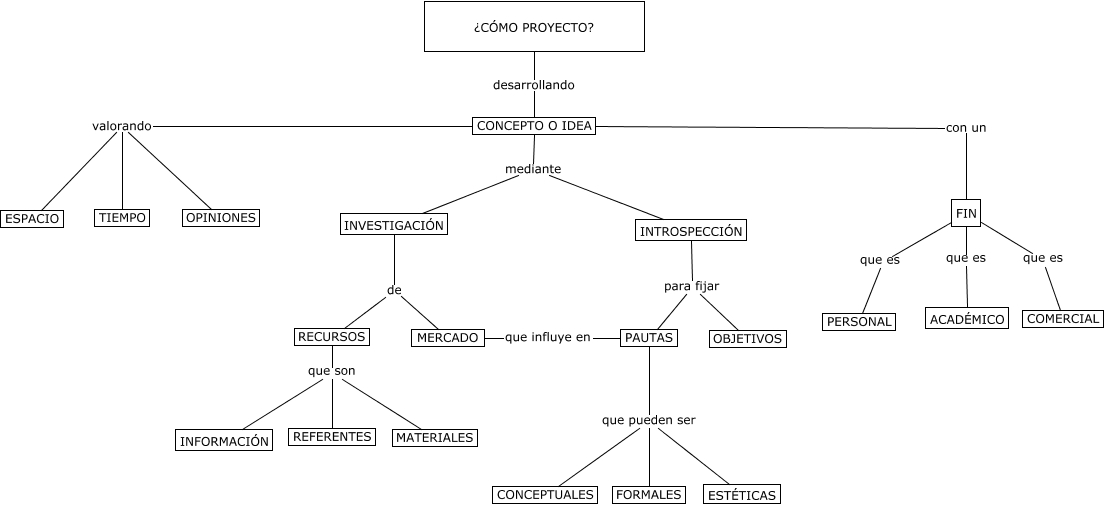 Este Cmap, tiene información relacionada con: Laura_García_Cómo_proyecto, INTROSPECCIÓN para fijar PAUTAS, FIN que es ACADÉMICO, PAUTAS que pueden ser CONCEPTUALES, CONCEPTO O IDEA valorando ESPACIO, PAUTAS que pueden ser ESTÉTICAS, INVESTIGACIÓN de MERCADO, INVESTIGACIÓN de RECURSOS, CONCEPTO O IDEA mediante INVESTIGACIÓN, FIN que es PERSONAL, RECURSOS que son MATERIALES, ¿CÓMO PROYECTO? desarrollando CONCEPTO O IDEA, CONCEPTO O IDEA mediante INTROSPECCIÓN, FIN que es COMERCIAL, CONCEPTO O IDEA valorando TIEMPO, CONCEPTO O IDEA valorando OPINIONES, RECURSOS que son REFERENTES, INTROSPECCIÓN para fijar OBJETIVOS, RECURSOS que son INFORMACIÓN, PAUTAS que pueden ser FORMALES, CONCEPTO O IDEA con un FIN