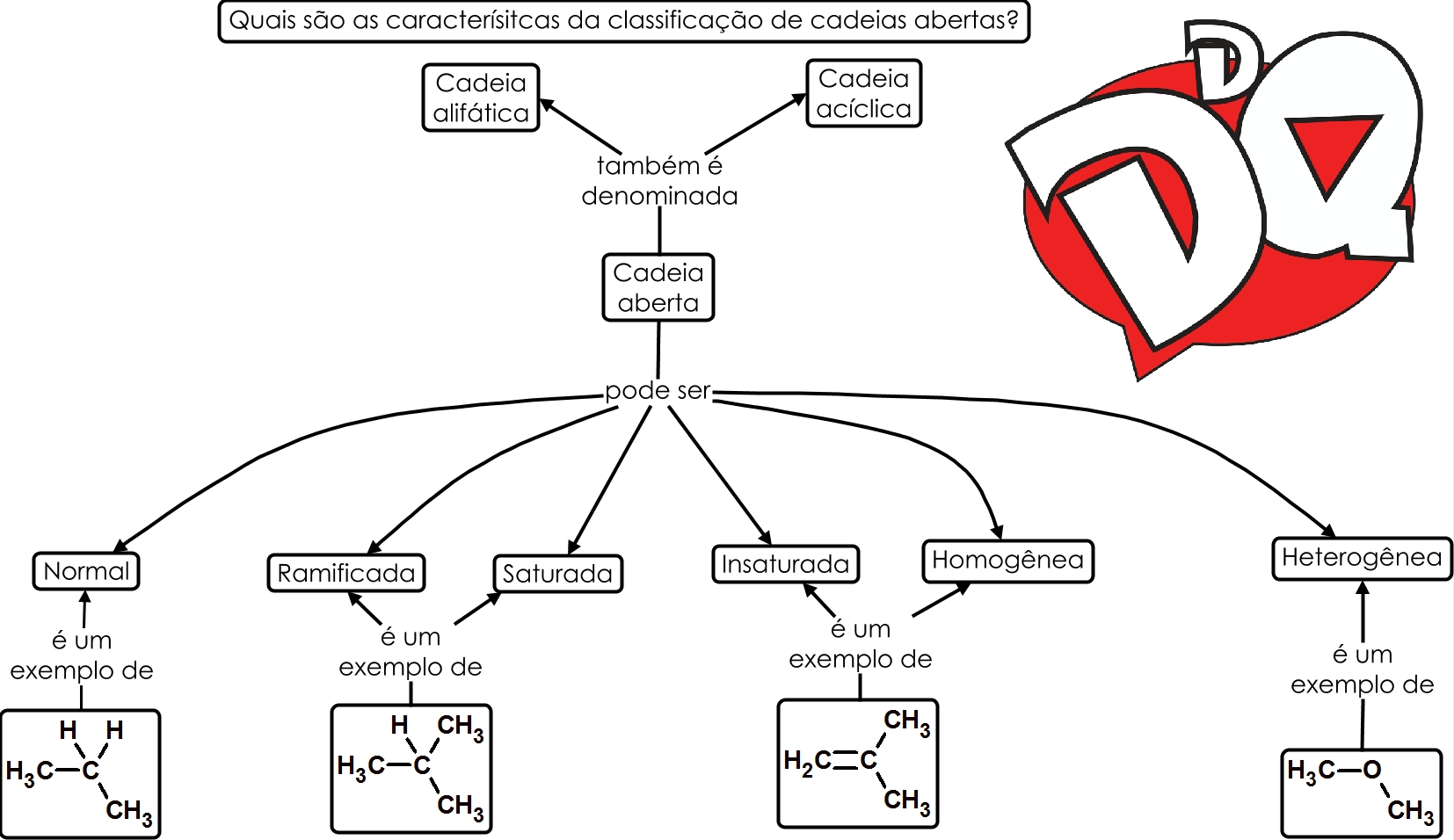 Esse mapa conceitual, produzido no IHMC CmapTools, tem a informação relacionada a: Cadeias abertas png, é um exemplo de Heterogênea, é um exemplo de Saturada, é um exemplo de Homogênea, Cadeia aberta também é denominada Cadeia alifática, Cadeia aberta pode ser Normal, é um exemplo de Normal, Cadeia aberta pode ser Ramificada, Cadeia aberta também é denominada Cadeia acíclica, Cadeia aberta pode ser Saturada, Cadeia aberta pode ser Homogênea, é um exemplo de Ramificada, é um exemplo de Insaturada, Cadeia aberta pode ser Insaturada, Cadeia aberta pode ser Heterogênea