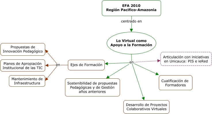 Este Cmap, tiene información relacionada con: EFA-2010_Virtualidad, Ejes de Formación en Planes de Apropiación Institucional de las TIC, EFA 2010 Región Pacifico-Amazonia centrado en Lo Virtual como Apoyo a la Formación, Lo Virtual como Apoyo a la Formación en Sostenibilidad de propuestas Pedagógicas y de Gestión años anteriores, Ejes de Formación en Propuestas de Innovación Pedagógico, Lo Virtual como Apoyo a la Formación en Ejes de Formación, Lo Virtual como Apoyo a la Formación en Articulación con iniciativas en Unicauca: PIS e ieRed, Lo Virtual como Apoyo a la Formación en Desarrollo de Proyectos Colaborativos Virtuales, Lo Virtual como Apoyo a la Formación en Cualificación de Formadores, Ejes de Formación en Mantenimiento de Infraestructura