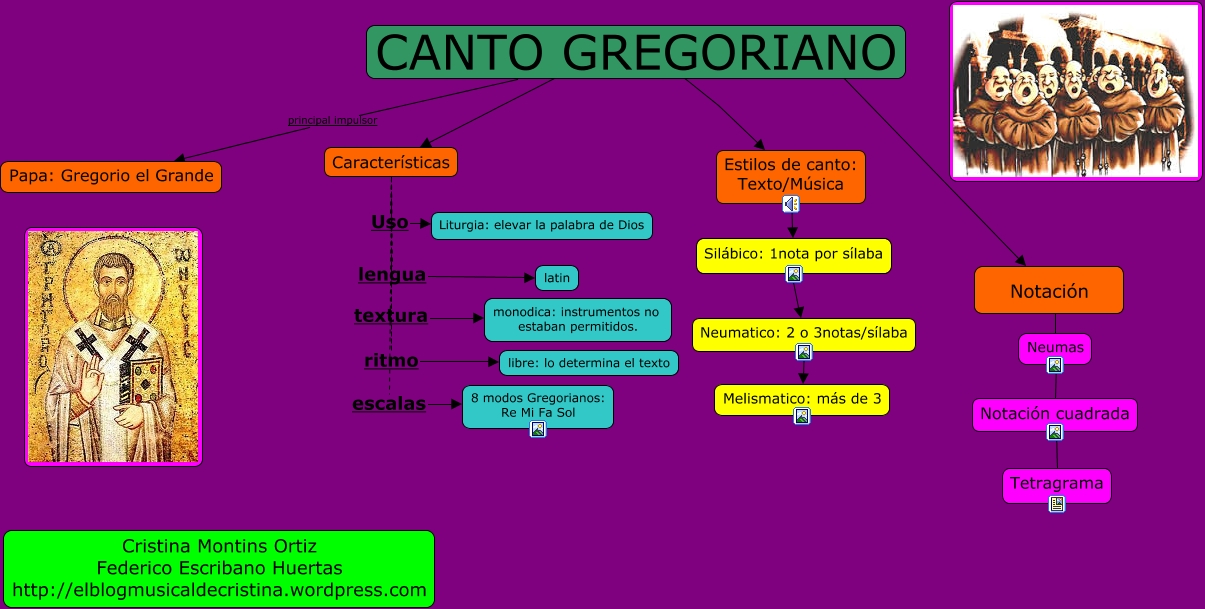 Este Cmap, tiene información relacionada con: canto gregoriano español BUENO, Estilos de canto: Texto/Música ???? Silábico: 1nota por sílaba, Características lengua latin, Características ritmo libre: lo determina el texto, Notación cuadrada ???? Tetragrama, Silábico: 1nota por sílaba ???? Neumatico: 2 o 3notas/sílaba, Neumatico: 2 o 3notas/sílaba ???? Melismatico: más de 3, Notación ???? Neumas, CANTO GREGORIANO ???? Características, Características escalas 8 modos Gregorianos: Re Mi Fa Sol, CANTO GREGORIANO ???? Notación, Neumas ???? Notación cuadrada, CANTO GREGORIANO principal impulsor Papa: Gregorio el Grande, CANTO GREGORIANO ???? Estilos de canto: Texto/Música, Características textura monodica: instrumentos no estaban permitidos., Características Uso Liturgia: elevar la palabra de Dios