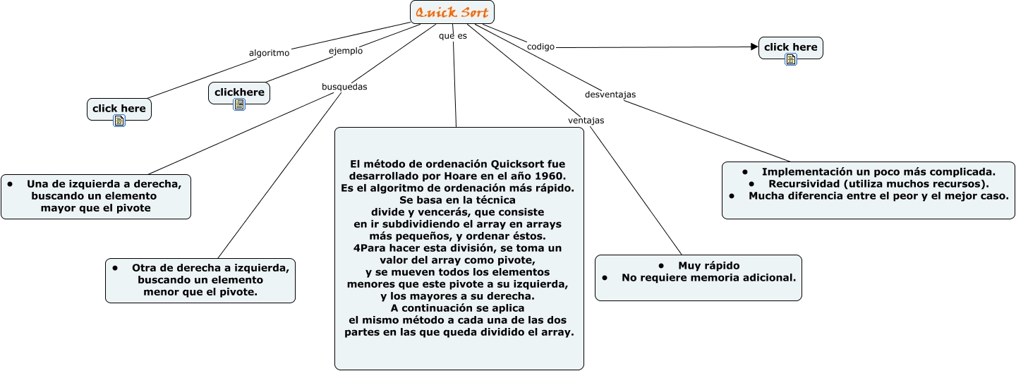Este Cmap, tiene información relacionada con: Quick Sort, Quick Sort algoritmo click here, Quick Sort codigo click here, Quick Sort busquedas • Otra de derecha a izquierda, buscando un elemento menor que el pivote., Quick Sort busquedas • Una de izquierda a derecha, buscando un elemento mayor que el pivote, Quick Sort desventajas • Implementación un poco más complicada. • Recursividad (utiliza muchos recursos). • Mucha diferencia entre el peor y el mejor caso., Quick Sort que es El método de ordenación Quicksort fue desarrollado por Hoare en el año 1960. Es el algoritmo de ordenación más rápido. Se basa en la técnica divide y vencerás, que consiste en ir subdividiendo el array en arrays más pequeños, y ordenar éstos. 4Para hacer esta división, se toma un valor del array como pivote, y se mueven todos los elementos menores que este pivote a su izquierda, y los mayores a su derecha. A continuación se aplica el mismo método a cada una de las dos partes en las que queda dividido el array., Quick Sort ventajas • Muy rápido • No requiere memoria adicional., Quick Sort ejemplo clickhere