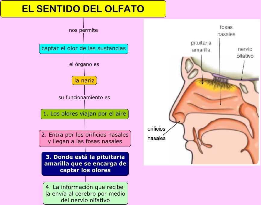 Este Cmap, tiene información relacionada con: El sentido del olfato, EL SENTIDO DEL OLFATO nos permite captar el olor de las sustancias, la nariz su funcionamiento es 1. Los olores viajan por el aire, 3. Donde está la pituitaria amarilla que se encarga de captar los olores 4. La información que recibe la envía al cerebro por medio del nervio olfativo, captar el olor de las sustancias el órgano es la nariz, 1. Los olores viajan por el aire 2. Entra por los orificios nasales y llegan a las fosas nasales, 2. Entra por los orificios nasales y llegan a las fosas nasales 3. Donde está la pituitaria amarilla que se encarga de captar los olores