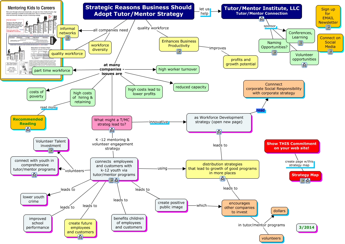 This Concept Map, created with IHMC CmapTools, has information related to: Strategic investment by business, Strategic Reasons Business Should Adopt Tutor/Mentor Strategy at many companies - issues are costs of poverty, connects employees and customers with k-12 youth via tutor/mentor programs leads to improved school performance, Tutor/Mentor Institute, LLC Tutor/Mentor Connection sponsor Conferences, Learning, Strategic Reasons Business Should Adopt Tutor/Mentor Strategy all companies need informal networks, high costs of hiring & retaining read more Recommended Reading, connects employees and customers with k-12 youth via tutor/mentor programs leads to create positive public image, connects employees and customers with k-12 youth via tutor/mentor programs leads to lower youth crime, Strategic Reasons Business Should Adopt Tutor/Mentor Strategy all companies need quality workforce, What might a T/MC strateg lead to? K -12 mentoring & volunteer engagement strategy connects employees and customers with k-12 youth via tutor/mentor programs, connects employees and customers with k-12 youth via tutor/mentor programs leads to benefits children of employees and customers, encourages other companies to invest in tutor/mentor programs dollars, Strategic Reasons Business Should Adopt Tutor/Mentor Strategy at many companies - issues are reduced capacity, Strategic Reasons Business Should Adopt Tutor/Mentor Strategy at many companies - issues are high worker turnover, Strategic Reasons Business Should Adopt Tutor/Mentor Strategy all companies need workforce diversity, Strategic Reasons Business Should Adopt Tutor/Mentor Strategy at many companies - issues are What might a T/MC strateg lead to?, connects employees and customers with k-12 youth via tutor/mentor programs volunteers connect with youth in comprehensive tutor/mentor programs, Strategic Reasons Business Should Adopt Tutor/Mentor Strategy let us help Tutor/Mentor Institute, LLC Tutor/Mentor Connection, as Workforce Development strategy (open new page) leads to distribution strategies that lead to growth of good programs in more places, Strategic Reasons Business Should Adopt Tutor/Mentor Strategy at many companies - issues are high costs lead to lower profits, Strategic Reasons Business Should Adopt Tutor/Mentor Strategy at many companies - issues are high costs of hiring & retaining