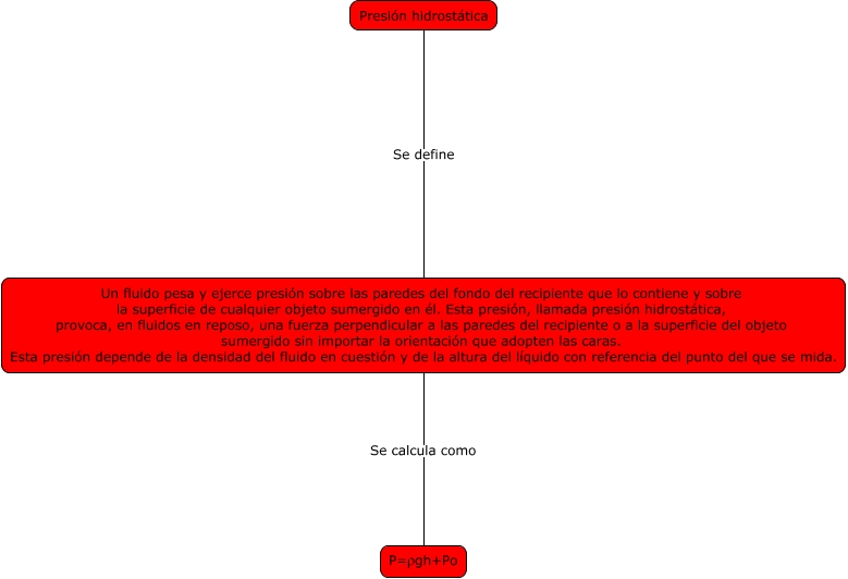 Este Cmap, tiene información relacionada con: hidrostatica, Presión hidrostática Se define Un fluido pesa y ejerce presión sobre las paredes del fondo del recipiente que lo contiene y sobre la superficie de cualquier objeto sumergido en él. Esta presión, llamada presión hidrostática, provoca, en fluidos en reposo, una fuerza perpendicular a las paredes del recipiente o a la superficie del objeto sumergido sin importar la orientación que adopten las caras. Esta presión depende de la densidad del fluido en cuestión y de la altura del líquido con referencia del punto del que se mida., Un fluido pesa y ejerce presión sobre las paredes del fondo del recipiente que lo contiene y sobre la superficie de cualquier objeto sumergido en él. Esta presión, llamada presión hidrostática, provoca, en fluidos en reposo, una fuerza perpendicular a las paredes del recipiente o a la superficie del objeto sumergido sin importar la orientación que adopten las caras. Esta presión depende de la densidad del fluido en cuestión y de la altura del líquido con referencia del punto del que se mida. Se calcula como P=�?gh+Po