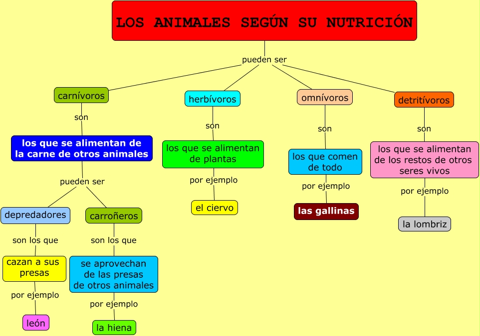 Este Cmap, tiene información relacionada con: LOS ANIMALES SEGÚN SU NUTRICIÓN, los que se alimentan de la carne de otros animales pueden ser depredadores, los que comen de todo por ejemplo las gallinas, los que se alimentan de la carne de otros animales pueden ser carroñeros, omnívoros son los que comen de todo, detritívoros son los que se alimentan de los restos de otros seres vivos, los que se alimentan de los restos de otros seres vivos por ejemplo la lombriz, LOS ANIMALES SEGÚN SU NUTRICIÓN pueden ser herbívoros, cazan a sus presas por ejemplo león, herbívoros son los que se alimentan de plantas, carroñeros son los que se aprovechan de las presas de otros animales, LOS ANIMALES SEGÚN SU NUTRICIÓN pueden ser omnívoros, se aprovechan de las presas de otros animales por ejemplo la hiena, LOS ANIMALES SEGÚN SU NUTRICIÓN pueden ser detritívoros, LOS ANIMALES SEGÚN SU NUTRICIÓN pueden ser carnívoros, depredadores son los que cazan a sus presas, los que se alimentan de plantas por ejemplo el ciervo, carnívoros son los que se alimentan de la carne de otros animales