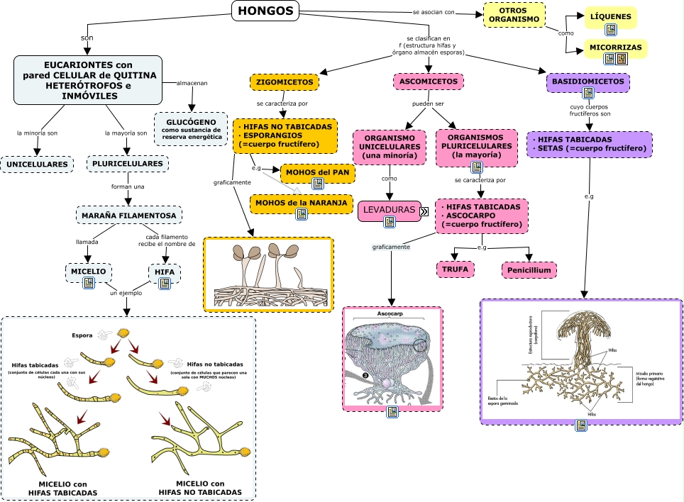 Este Cmap, tiene información relacionada con: 7.10 Hongos Imprimir, HONGOS se asocian con OTROS ORGANISMO, ZIGOMICETOS se caracteriza por · HIFAS NO TABICADAS · ESPORANGIOS (=cuerpo fructífero), ENFERMEDADES como cornezuelo del centeno, ORGANISMO UNICELULARES (una minoría) como LEVADURAS, · HIFAS NO TABICADAS · ESPORANGIOS (=cuerpo fructífero) e.g MOHOS de la NARANJA, · HIFAS NO TABICADAS · ESPORANGIOS (=cuerpo fructífero) e.g MOHOS de la NARANJA, EUCARIONTES con pared CELULAR de QUITINA HETERÓTROFOS e INMÓVILES la minoría son UNICELULARES, OTROS ORGANISMO como LÍQUENES, MARAÑA FILAMENTOSA llamada MICELIO, ENFERMEDADES como grafiosis del olmo, · HIFAS TABICADAS · ASCOCARPO (=cuerpo fructífero) e.g TRUFA, OTROS ORGANISMO como MICORRIZAS, LEVADURAS (unicelares) se utlizan para PRODUCIR PAN CEVEZA VINO SIDRA, · HIFAS NO TABICADAS · ESPORANGIOS (=cuerpo fructífero) e.g MOHOS del PAN, · HIFAS TABICADAS · SETAS (=cuerpo fructífero) e.g, ASCOMICETOS pueden ser ORGANISMOS PLURICELULARES (la mayoría), LEVADURAS (unicelares) otras causan ENFERMEDADES, · HIFAS TABICADAS · ASCOCARPO (=cuerpo fructífero) e.g Penicillium, BASIDIOMICETOS cuyo cuerpos fructíferos son · HIFAS TABICADAS · SETAS (=cuerpo fructífero), HONGOS se clasifican en f (estructura hifas y órgano almacén esporas) ZIGOMICETOS