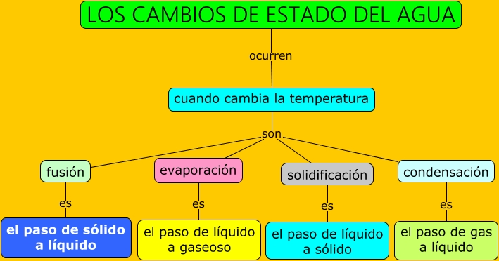 Este Cmap, tiene información relacionada con: Los cambios de estado del agua, condensación es el paso de gas a líquido, LOS CAMBIOS DE ESTADO DEL AGUA ocurren cuando cambia la temperatura, cuando cambia la temperatura son evaporación, cuando cambia la temperatura son condensación, fusión es el paso de sólido a líquido, cuando cambia la temperatura son solidificación, solidificación es el paso de líquido a sólido, evaporación es el paso de líquido a gaseoso, cuando cambia la temperatura son fusión