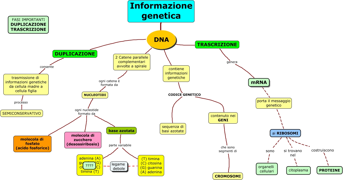 Questa Cmap, creata con IHMC CmapTools, contiene informazioni relative a: DNA, base azotata parte variabile (T) timina (C) citosina (G) guanina (A) adenina, Informazione genetica DNA 2 Catene parallele complementari avvolte a spirale, NUCLEOTIDI ogni nucleotide formato da molecola di zucchero (desossiribosio), trasmissione di informazioni genetiche da cellula madre a cellula figlia processo SEMICONSERVATIVO, Informazione genetica DNA DUPLICAZIONE, Informazione genetica DNA contiene informazioni genetiche, ???? legame debole (T) timina (C) citosina (G) guanina (A) adenina, ai RIBOSOMI costruiscono PROTEINE, NUCLEOTIDI ogni nucleotide formato da molecola di fosfato (acido fosforico), base azotata parte variabile adenina (A) guanina (G) citosina (C) timina (T), contiene informazioni genetiche CODICE GENETICO contenuto nei GENI, contiene informazioni genetiche CODICE GENETICO sequenza di basi azotate, 2 Catene parallele complementari avvolte a spirale ogni catena è formata da NUCLEOTIDI, mRNA porta il messaggio genetico ai RIBOSOMI, Informazione genetica DNA TRASCRIZIONE, ai RIBOSOMI si trovano nel citoplasma, ai RIBOSOMI sono organelli cellulari, contenuto nei GENI che sono segmenti di CROMOSOMI, NUCLEOTIDI ogni nucleotide formato da base azotata, DUPLICAZIONE consente trasmissione di informazioni genetiche da cellula madre a cellula figlia