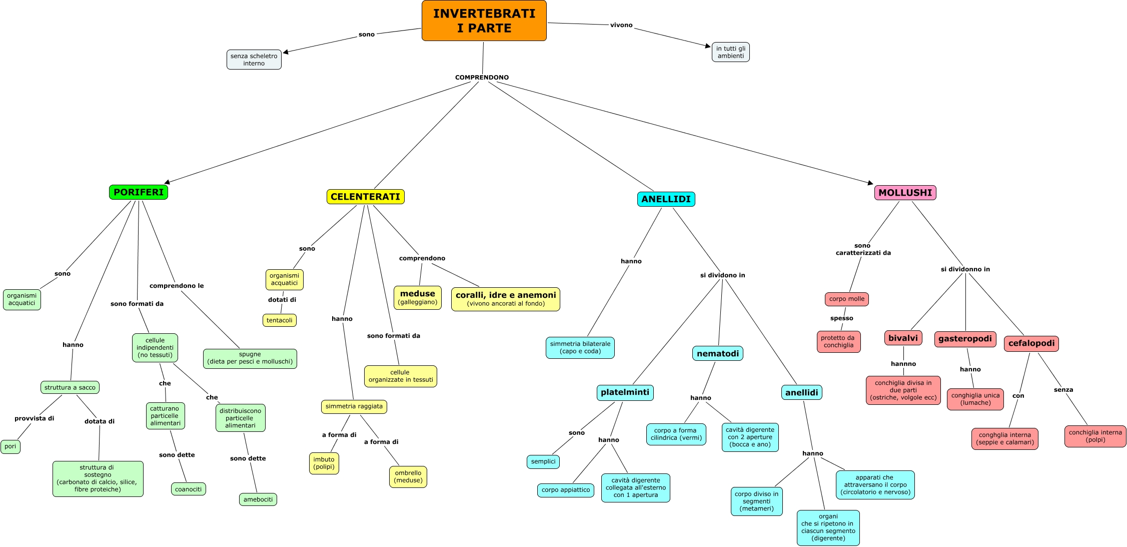 Questa Cmap, creata con IHMC CmapTools, contiene informazioni relative a: INVERTEBRATI, MOLLUSHI sono caratterizzati da corpo molle, PORIFERI hanno struttura a sacco, MOLLUSHI si dividonno in cefalopodi, cellule indipendenti (no tessuti) che catturano particelle alimentari, platelminti hanno corpo appiattico, platelminti sono semplici, INVERTEBRATI I PARTE COMPRENDONO PORIFERI, INVERTEBRATI I PARTE COMPRENDONO ANELLIDI, distribuiscono particelle alimentari sono dette amebociti, simmetria raggiata a forma di imbuto (polipi), anellidi hanno apparati che attraversano il corpo (circolatorio e nervoso), anellidi hanno organi che si ripetono in ciascun segmento (digerente), INVERTEBRATI I PARTE vivono in tutti gli ambienti, simmetria raggiata a forma di ombrello (meduse), nematodi hanno corpo a forma cilindrica (vermi), anellidi hanno corpo diviso in segmenti (metameri), CELENTERATI comprendono coralli, idre e anemoni (vivono ancorati al fondo), nematodi hanno cavità digerente con 2 aperture (bocca e ano), PORIFERI comprendono le spugne (dieta per pesci e molluschi), CELENTERATI sono formati da cellule organizzate in tessuti