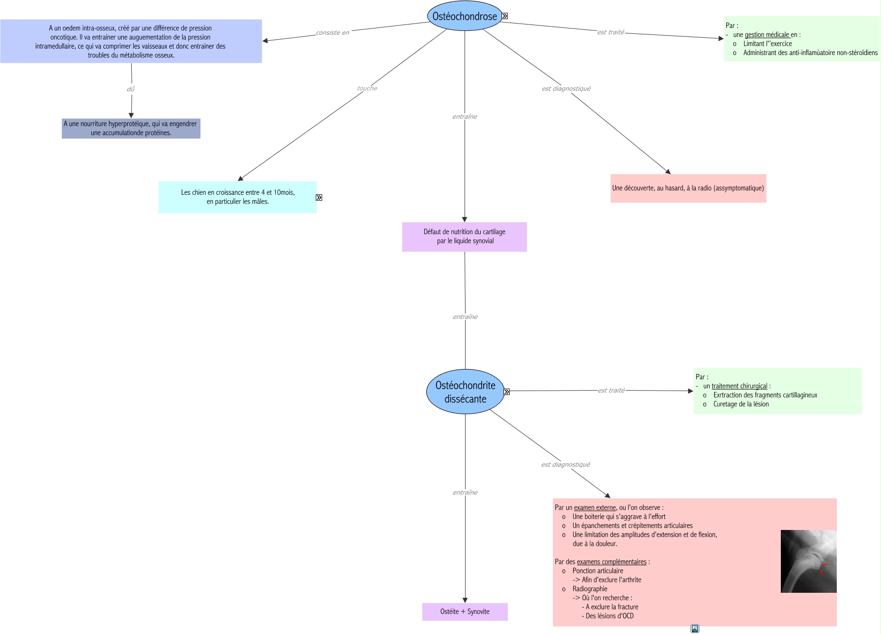 Cette carte de concepts créée avec IHMC CmapTools traite de: Ostéochondrose-Ostéochondrite-dissécante-Roxanne, Les chien en croissance entre 4 et 10mois, en particulier les mâles. Tels que Setter, Ostéochondrose entraîne Défaut de nutrition du cartilage par le liquide synovial, A un oedem intra-osseux, créé par une différence de pression oncotique. Il va entrainer une auguementation de la pression intramedullaire, ce qui va comprimer les vaisseaux et donc entrainer des troubles du métabolisme osseux. dû A une nourriture hyperprotéique, qui va engendrer une accumulationde protéines., Les chien en croissance entre 4 et 10mois, en particulier les mâles. Tels que Golden retriever, Ostéochondrose est diagnostiqué Une découverte, au hasard, à la radio (assymptomatique), Ostéochondrose consiste en A un oedem intra-osseux, créé par une différence de pression oncotique. Il va entrainer une auguementation de la pression intramedullaire, ce qui va comprimer les vaisseaux et donc entrainer des troubles du métabolisme osseux., Ostéochondrite dissécante est diagnostiqué Par un examen externe, ou l'on observe : o Une boiterie qui s'aggrave à l'effort o Un épanchements et crépitements articulaires o Une limitation des amplitudes d'extension et de flexion, due à la douleur. Par des examens complémentaires : o Ponction articulaire -> Afin d'exclure l'arthrite o Radiographie -> Où l'on recherche : - A exclure la fracture - Des lésions d'OCD, Ostéochondrose est traité Par : - une gestion médicale en : o Limitant l'’exercice o Administrant des anti-inflamùatoire non-stéroïdiens, Les chien en croissance entre 4 et 10mois, en particulier les mâles. Tels que Labrador, Les chien en croissance entre 4 et 10mois, en particulier les mâles. Tels que Rottweiler, Défaut de nutrition du cartilage par le liquide synovial entraîne Ostéochondrite dissécante, Ostéochondrite dissécante entraîne Ostéite + Synovite, Ostéochondrite dissécante est traité Par : - un traitement chirurgical : o Exrtraction des fragments cartillagineux o Curetage de la lésion, Les chien en croissance entre 4 et 10mois, en particulier les mâles. Tels que Berger allemand