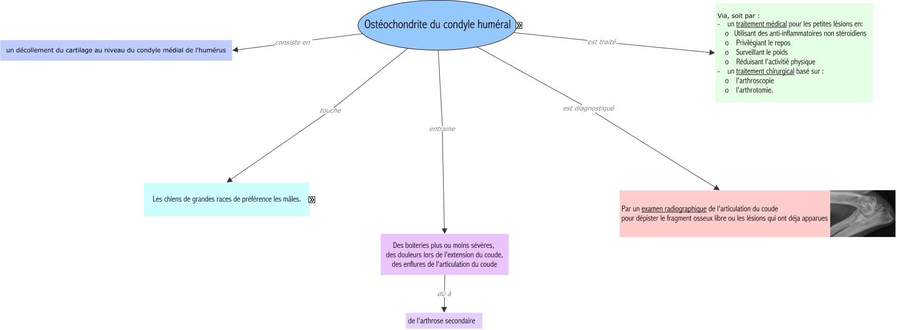 Cette carte de concepts créée avec IHMC CmapTools traite de: Ostéochondrite du condyle humérale-Camille, les chiens de grandes races de préférence les mâles Tels que Labrador, Ostéochondrite du condyle huméral entraine Des boiteries plus ou moins sévères, des douleurs lors de l'extension du coude, des enflures de l'articulation du coude, les chiens de grandes races de préférence les mâles Tels que Saint-Bernard, les chiens de grandes races de préférence les mâles Tels que Golden retriever, Ostéochondrite du condyle huméral est traité Via, soit par : - un traitement médical pour les petites lésions en: o Utilisant des anti-inflammatoires non stéroidiens o Privilégiant le repos o Surveillant le poids o Réduisant l'activitié physique - un traitement chirurgical basé sur : o l'arthroscopie o l'arthrotomie., les chiens de grandes races de préférence les mâles Tels que Cane corso, Ostéochondrite du condyle huméral consiste en un décollement du cartilage au niveau du condyle médial de l'humérus, Ostéochondrite du condyle huméral est diagnostiqué Par un examen radiographique de l'articulation du coude pour dépister le fragment osseux libre ou les lésions qui ont déja apparues, les chiens de grandes races de préférence les mâles Tels que Berger allemand, Ostéochondrite du condyle huméral touche Les chiens de grandes races de préférence les mâles., les chiens de grandes races de préférence les mâles Tels que Rottweiler