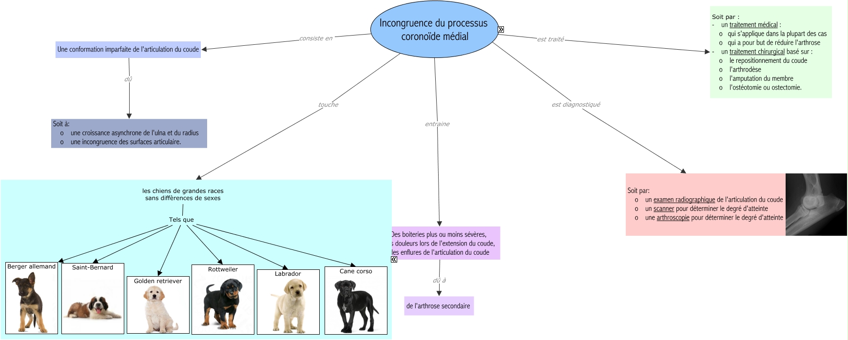 Cette carte de concepts créée avec IHMC CmapTools traite de: Incongruence du processus coronoïde médial-Camille, les chiens de grandes races sans diffèrences de sexes Tels que Cane corso, Incongruence du processus coronoïde médial entraine Des boiteries plus ou moins sévères, des douleurs lors de l'extension du coude, des enflures de l'articulation du coude, les chiens de grandes races sans diffèrences de sexes Tels que Saint-Bernard, les chiens de grandes races sans diffèrences de sexes Tels que Berger allemand, Incongruence du processus coronoïde médial est traité Soit par : - un traitement médical : o qui s'applique dans la plupart des cas o qui a pour but de réduire l'arthrose - un traitement chirurgical basé sur : o le repositionnement du coude o l'arthrodèse o l'amputation du membre o l'ostéotomie ou ostectomie., les chiens de grandes races sans diffèrences de sexes Tels que Golden retriever, Incongruence du processus coronoïde médial touche Les chiens de grandes races sans différences de sexes., Une conformation imparfaite de l'articulation du coude dû Soit à: o une croissance asynchrone de l'ulna et du radius o une incongruence des surfaces articulaire., Incongruence du processus coronoïde médial consiste en Une conformation imparfaite de l'articulation du coude, les chiens de grandes races sans diffèrences de sexes Tels que Rottweiler, Incongruence du processus coronoïde médial est diagnostiqué Soit par: o un examen radiographique de l'articulation du coude o un scanner pour déterminer le degré d'atteinte o une arthroscopie pour déterminer le degré d'atteinte, les chiens de grandes races sans diffèrences de sexes Tels que Labrador