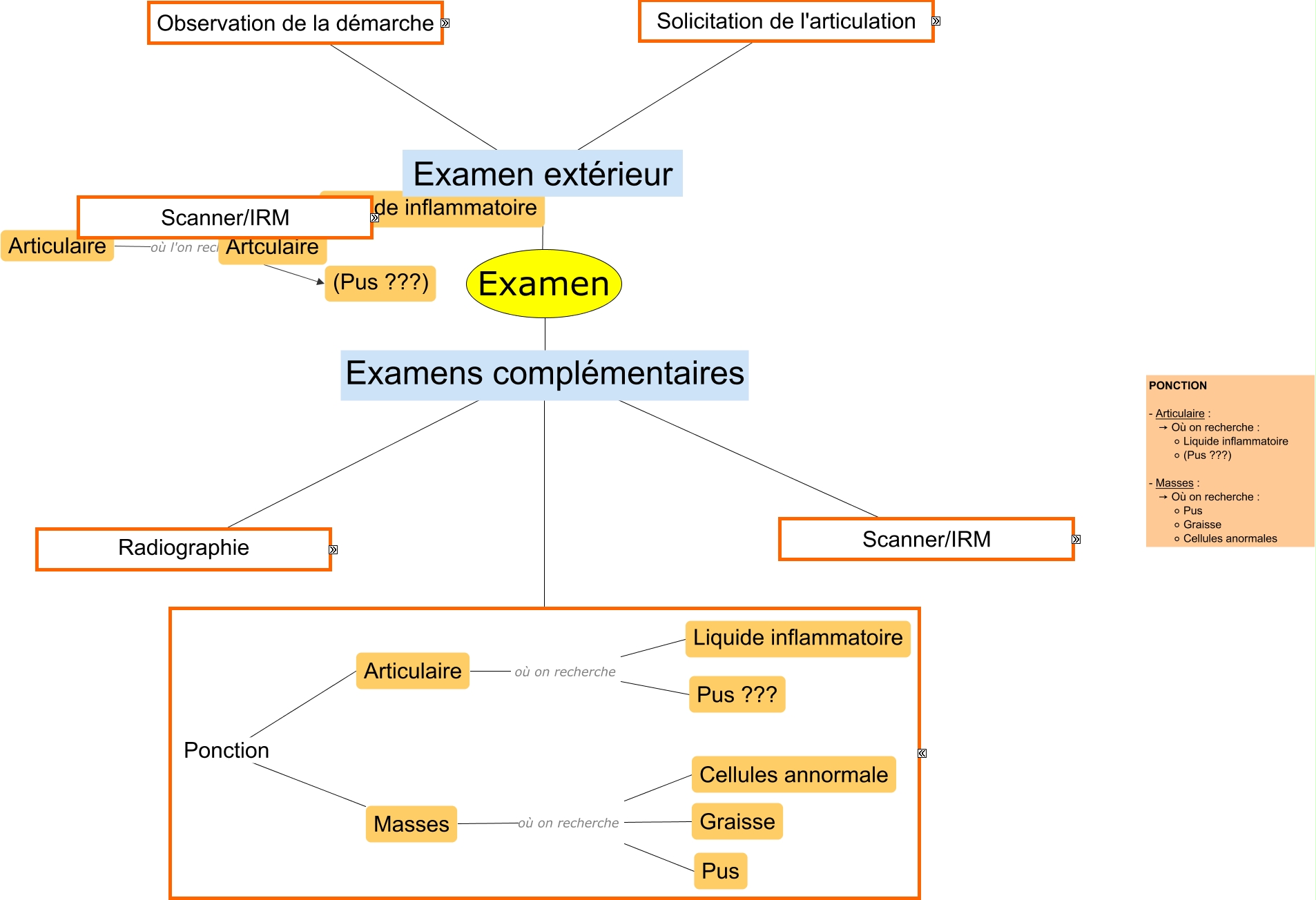 Cette carte de concepts créée avec IHMC CmapTools traite de: Brouillon Examen Roxane, Examen extérieur ???? Examen, Solicitation de l'articulation se pratique Solcitation jusqu'à l'ouverture et la fermeture maximale non pathologique de l'articulation, Scanner/IRM permet de voir Lésions ligamentaires, Observation de la démarche où l'on recherche Bruits annormaux (crépitements, craquements, ...), Articulaire où on recherche Liquide inflammatoire, Radiographie où l'on recherche Fractures/fêlures, Solicitation de l'articulation examens spécifiques Test du tiroir : ....., Examen ???? Examens complémentaires, Scanner/IRM permet de voir Lesions musculaires, Articulaire où l'on recherche (Pus ???), Radiographie où l'on recherche Annomalies de densité, Solicitation de l'articulation où l'on recherche Diminution ou augmentation de l'amplitude articulaire, Ponction Articulaire, Solicitation de l'articulation examens spécifiques Signe d'Ortolani : ....., Observation de la démarche ???? Examen extérieur, Radiographie où l'on recherche Annomalies de forme, Masses ???? Pus, Observation de la démarche où l'on recherche Annomalies de démarche, Radiographie ???? Examens complémentaires, Articulaire où on recherche Pus ???