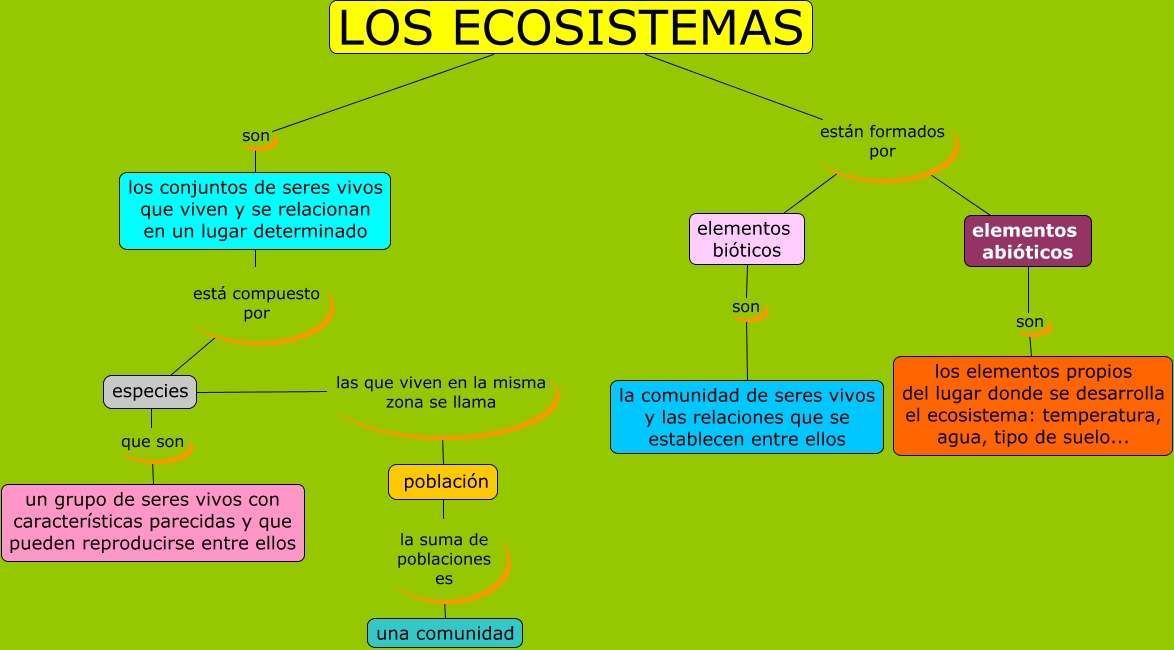 Este Cmap, tiene información relacionada con: Los ecosistemas, los conjuntos de seres vivos que viven y se relacionan en un lugar determinado está compuesto por especies, población la suma de poblaciones es una comunidad, especies que son un grupo de seres vivos con características parecidas y que pueden reproducirse entre ellos, especies las que viven en la misma zona se llama población, LOS ECOSISTEMAS están formados por elementos abióticos, LOS ECOSISTEMAS están formados por elementos bióticos, elementos abióticos son los elementos propios del lugar donde se desarrolla el ecosistema: temperatura, agua, tipo de suelo..., LOS ECOSISTEMAS son los conjuntos de seres vivos que viven y se relacionan en un lugar determinado, elementos bióticos son la comunidad de seres vivos y las relaciones que se establecen entre ellos