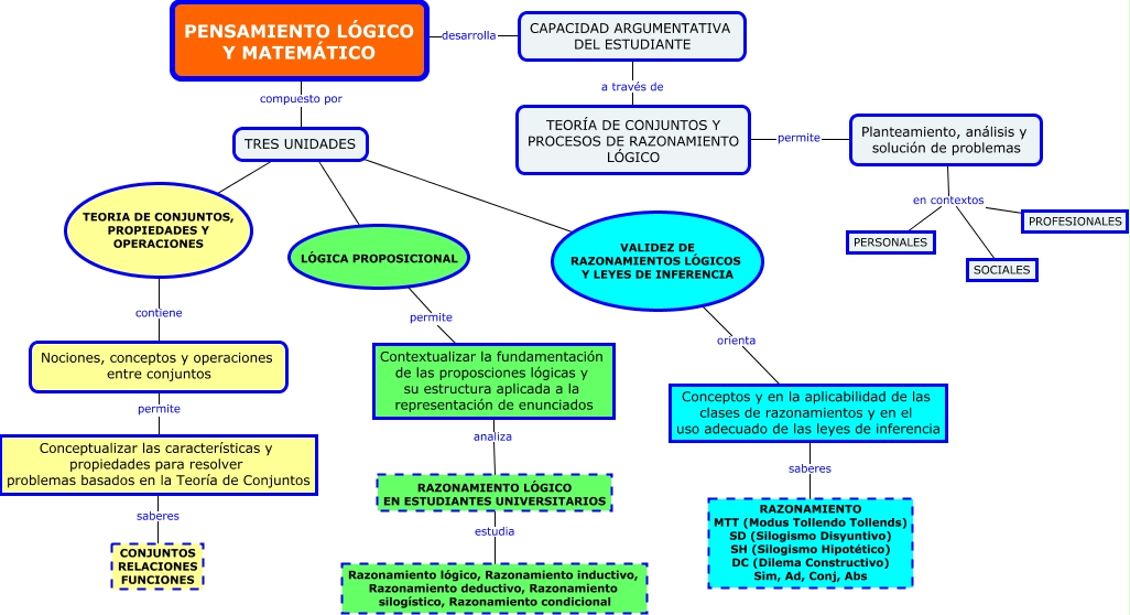 Este Cmap, tiene información relacionada con: PENSAMIENTO LOGICO Y MATEMATICO, Contextualizar la fundamentación de las proposciones lógicas y su estructura aplicada a la representación de enunciados analiza RAZONAMIENTO LÓGICO EN ESTUDIANTES UNIVERSITARIOS, VALIDEZ DE RAZONAMIENTOS LÓGICOS Y LEYES DE INFERENCIA orienta Conceptos y en la aplicabilidad de las clases de razonamientos y en el uso adecuado de las leyes de inferencia, PENSAMIENTO LÓGICO Y MATEMÁTICO desarrolla CAPACIDAD ARGUMENTATIVA DEL ESTUDIANTE, RAZONAMIENTO LÓGICO EN ESTUDIANTES UNIVERSITARIOS estudia Razonamiento lógico, Razonamiento inductivo, Razonamiento deductivo, Razonamiento silogístico, Razonamiento condicional, LÓGICA PROPOSICIONAL permite Contextualizar la fundamentación de las proposciones lógicas y su estructura aplicada a la representación de enunciados, Planteamiento, análisis y solución de problemas en contextos PERSONALES, PENSAMIENTO LÓGICO Y MATEMÁTICO compuesto por TRES UNIDADES, Conceptos y en la aplicabilidad de las clases de razonamientos y en el uso adecuado de las leyes de inferencia saberes RAZONAMIENTO MTT (Modus Tollendo Tollends) SD (Silogismo Disyuntivo) SH (Silogismo Hipotético) DC (Dilema Constructivo) Sim, Ad, Conj, Abs, Planteamiento, análisis y solución de problemas en contextos PROFESIONALES, SOCIALES en contextos PERSONALES, Conceptualizar las características y propiedades para resolver problemas basados en la Teoría de Conjuntos saberes CONJUNTOS RELACIONES FUNCIONES, TRES UNIDADES ???? VALIDEZ DE RAZONAMIENTOS LÓGICOS Y LEYES DE INFERENCIA, TRES UNIDADES ???? TEORIA DE CONJUNTOS, PROPIEDADES Y OPERACIONES, Nociones, conceptos y operaciones entre conjuntos permite Conceptualizar las características y propiedades para resolver problemas basados en la Teoría de Conjuntos, TEORÍA DE CONJUNTOS Y PROCESOS DE RAZONAMIENTO LÓGICO permite Planteamiento, análisis y solución de problemas, TRES UNIDADES ???? LÓGICA PROPOSICIONAL, TEORIA DE CONJUNTOS, PROPIEDADES Y OPERACIONES contiene Nociones, conceptos y operaciones entre conjuntos, SOCIALES en contextos PROFESIONALES, CAPACIDAD ARGUMENTATIVA DEL ESTUDIANTE a través de TEORÍA DE CONJUNTOS Y PROCESOS DE RAZONAMIENTO LÓGICO