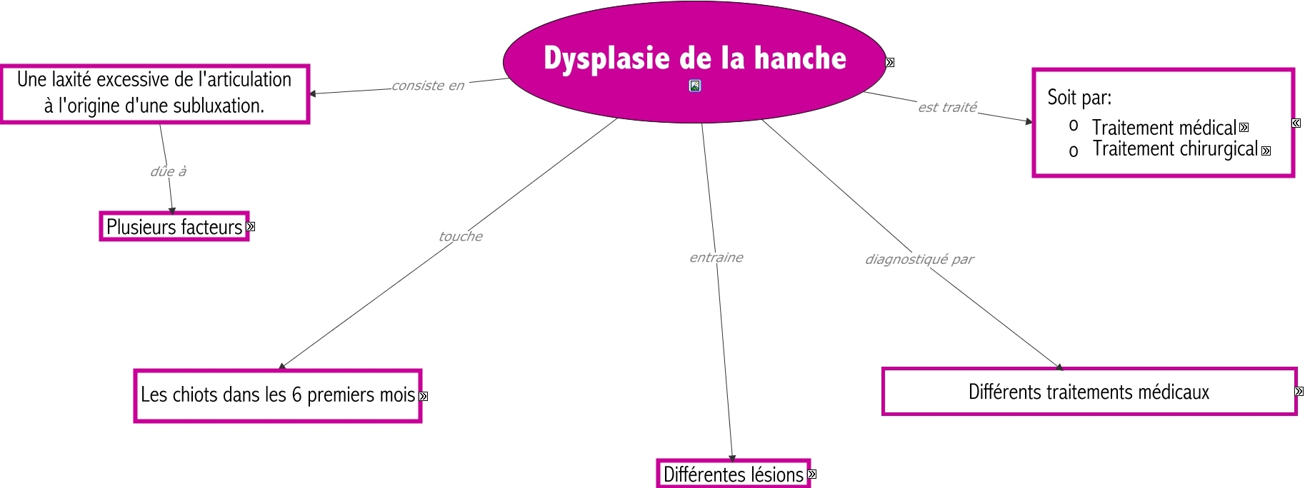 Cette carte de concepts créée avec IHMC CmapTools traite de: Dysplasie-de-la-hanche-Anne-Flore, Par différents examens médicaux : et nottament - un examen orthopédique, avec : palpation des hanches manipulation spécifiques : le signe d'Ortolani, Par différents examens médicaux : et nottament - un examen radiographique, Différentes lésions avec - Dans un premier temps une inflammation locale et de l'arthrose, Les chiots dans les 6 premiers mois de race Labrador, Plusieurs facteurs qui sont - Des facteurs extérieurs : croissance trop rapide, activités physiques, suralimentation., Dysplasie de la hanche touche Les chiots dans les 6 premiers mois, Dysplasie de la hanche entraine Différentes lésions, Traitement médical avec Cure antalgique pour soulager la douleur, -Dans un second temps des lésions progressives tels que Lésions des ligaments et des os, -Dans un second temps des lésions progressives tels que Un étirement de la capsule articulaire., Les chiots dans les 6 premiers mois de race Golden retriever, Traitement chirurgical basé sur une symphysiodèse, Par différents examens médicaux : et nottament - une étude de la démarche et de la posture (raideur au lever, difficultés dans les escaliers...), Traitement chirurgical basé sur une double ostéotomie du bassin, Dysplasie de la hanche consiste en Une laxité excessive de l'articulation à l'origine d'une subluxation., Une laxité excessive de l'articulation à l'origine d'une subluxation. dûe à Plusieurs facteurs, -Dans un second temps des lésions progressives tels que Des micro-fractures du cartilage, Traitement chirurgical basé sur une prothèse de hanche, Traitement médical avec Surveillance de l'alimentation, Dysplasie de la hanche est traité ????