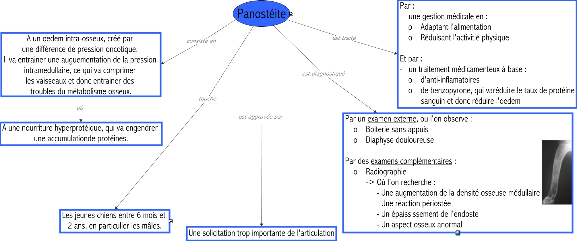Cette carte de concepts créée avec IHMC CmapTools traite de: Panostéite-Roxanne, Panostéite est traité Par : - une gestion médicale en : o Adaptant l'alimentation o Réduisant l'activitié physique Et par : - un traitement médicamenteux à base : o d'anti-inflamatoires o de benzopyrone, qui varéduire le taux de protéine sanguin et donc réduire l'oedem, A un oedem intra-osseux, créé par une différence de pression oncotique. Il va entrainer une auguementation de la pression intramedullaire, ce qui va comprimer les vaisseaux et donc entrainer des troubles du métabolisme osseux. dû A une nourriture hyperprotéique, qui va engendrer une accumulationde protéines., Panostéite touche Les jeunes chiens entre 6 mois et 2 ans, en particulier les mâles., Les jeunes chiens entre 6 mois et 2 ans, en particulier les mâles. tels que Saint-Bernard, Panostéite consiste en A un oedem intra-osseux, créé par une différence de pression oncotique. Il va entrainer une auguementation de la pression intramedullaire, ce qui va comprimer les vaisseaux et donc entrainer des troubles du métabolisme osseux., Les jeunes chiens entre 6 mois et 2 ans, en particulier les mâles. tels que Airedales terrier, Les jeunes chiens entre 6 mois et 2 ans, en particulier les mâles. tels que Setter irelandais, Les jeunes chiens entre 6 mois et 2 ans, en particulier les mâles. tels que Doberman, Les jeunes chiens entre 6 mois et 2 ans, en particulier les mâles. tels que Berger allemand, Les jeunes chiens entre 6 mois et 2 ans, en particulier les mâles. tels que Golden retriever, Panostéite est diagnostiqué Par un examen externe, ou l'on observe : o Boiterie sans appuis o Diaphyse douloureuse Par des examens complémentaires : o Radiographie -> Où l'on recherche : - Une augmentation de la densité osseuse médullaire - Une réaction périostée - Un épaississement de l'endoste - Un aspect osseux anormal, Les jeunes chiens entre 6 mois et 2 ans, en particulier les mâles. tels que Bauceron, Les jeunes chiens entre 6 mois et 2 ans, en particulier les mâles. tels que Dogue allemand, Les jeunes chiens entre 6 mois et 2 ans, en particulier les mâles. tels que Basset, Panostéite est aggravée par Une solicitation trop importante de l'articulation