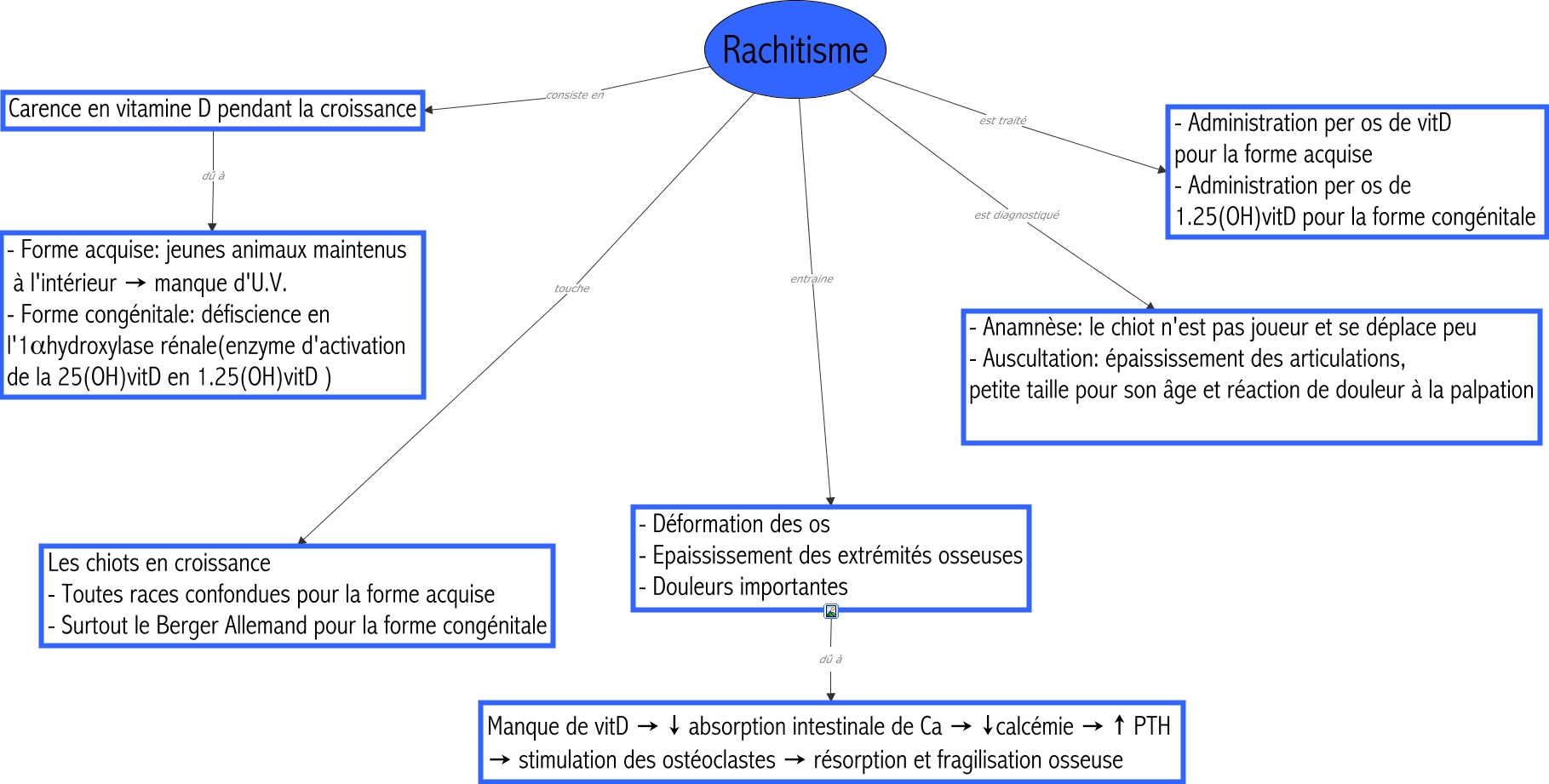 Cette carte de concepts créée avec IHMC CmapTools traite de: Rachitisme-adeline, Rachitisme entraine - Déformation des os - Epaississement des extrémités osseuses - Douleurs importantes, Carence en vitamine D pendant la croissance dû à - Forme acquise: jeunes animaux maintenus à l'intérieur → manque d'U.V. - Forme congénitale: défiscience en l'1αhydroxylase rénale(enzyme d'activation de la 25(OH)vitD en 1.25(OH)vitD ), Rachitisme est diagnostiqué - Anamnèse: le chiot n'est pas joueur et se déplace peu - Auscultation: épaississement des articulations, petite taille pour son âge et réaction de douleur à la palpation, Rachitisme touche Les chiots en croissance - Toutes races confondues pour la forme acquise - Surtout le Berger Allemand pour la forme congénitale, Rachitisme est traité - Administration per os de vitD pour la forme acquise - Administration per os de 1.25(OH)vitD pour la forme congénitale, Rachitisme consiste en Carence en vitamine D pendant la croissance