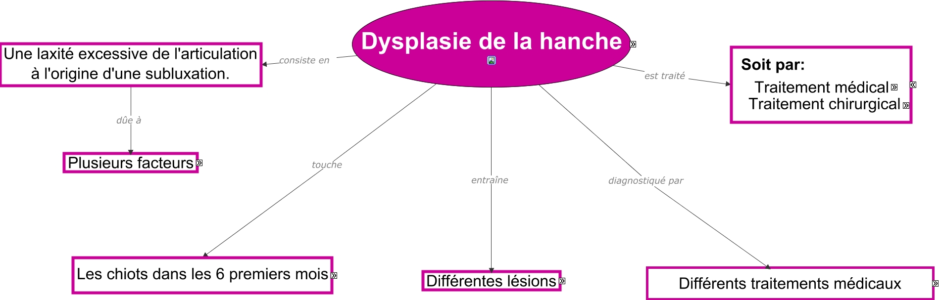Cette carte de concepts créée avec IHMC CmapTools traite de: Dysplasie-de-la-hanche-Anne-Flore, Les chiots dans les 6 premiers mois de race Golden retriever (23%), Dans un second temps : des lésions progressives telles que Des micro-fractures du cartilage, Dysplasie de la hanche touche Les chiots dans les 6 premiers mois, Plusieurs facteurs qui sont Un nombre important de gènes., Une laxité excessive de l'articulation à l'origine d'une subluxation. dûe à Plusieurs facteurs, Dysplasie de la hanche entraîne Différentes lésions, Dans un premier temps : une inflammation locale et de l'arthrose et Dans un second temps : des lésions progressives, Des facteurs extérieurs. manque d'activité physique, Dysplasie de la hanche consiste en Une laxité excessive de l'articulation à l'origine d'une subluxation., Des facteurs extérieurs. excès d'activité physique, Par différents examens médicaux : et nottament une étude de la démarche et de la posture (raideur au lever, difficultés dans les escaliers...), mise en évidence du rebord acétabulaire dorsal décubitus ventral, les hanches en hyper flexion, bassin relevé par traction des jarrets, sur le dos, les membres en extension mesure de l'angle de Norberg-Olson, estimation de la profondeur acétabulaire en décubitus dorsale, articulation des genoux et des hanches fléchies au maximum et abduction complète, mesure de l'angle de Norberg-Olson classification en 5 stades : A, B, C, D, E, Traitement médical avec Cure antalgique pour soulager la douleur: AINS, Par différents examens médicaux : et nottament un examen radiographique, décubitus ventral, les hanches en hyper flexion, bassin relevé par traction des jarrets angle d'inclinaison doit être inférieur ou égal à 7,5°, Traitement chirurgical basé sur une prothèse de hanche, mesure de l'indice de distraction ou de l'indice de subluxation peut-être réalisé dès 4 mois