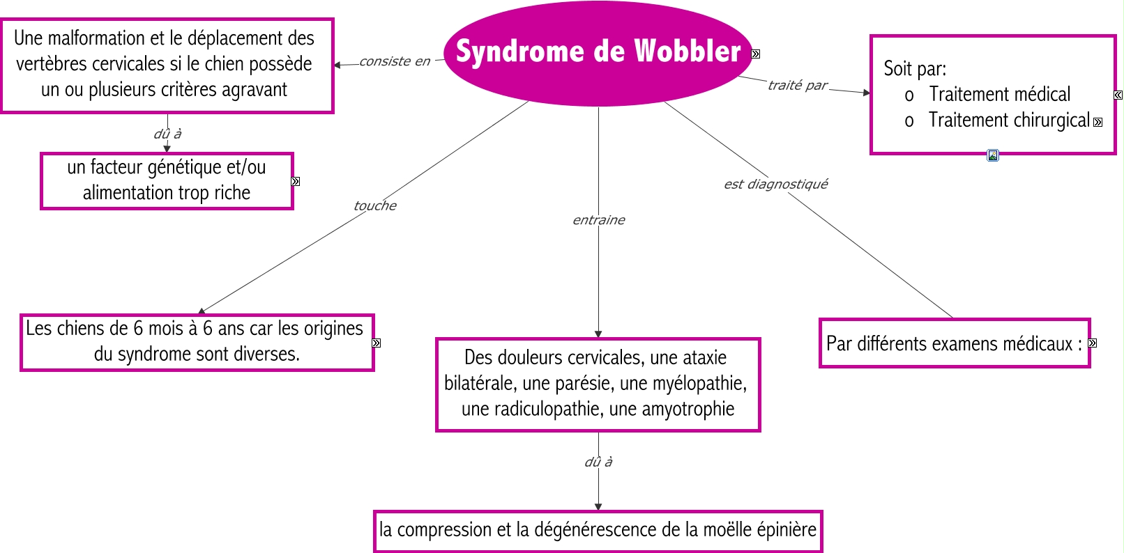 Cette carte de concepts créée avec IHMC CmapTools traite de: Alex-Syndrome-de-Wobbler, Différents examens Un examen neurologique, Traitement chirurgical basé sur la laminectomie, un facteur génétique et/ou alimentation trop riche ou calcium, ralenti la résorption osseuse du canal vertébral qui devient trop étroit, Les chiens de 6 mois à 6 ans car les origines du syndrome sont diverses. Tels que Dogue allemand, un examen radiographique pour dépister une sténose du canal vertébral, Différents examens un examen radiographique, Syndrome de Wobbler consiste en Une malformation et le déplacement des vertèbres cervicales si le chien possède un ou plusieurs critères agravant, la sécrétion de calcitonine par la glande thyroïde, Syndrome de Wobbler entraine Des douleurs cervicales, une ataxie bilatérale, une parésie, une myélopathie, une radiculopathie, une amyotrophie, Une malformation et le déplacement des vertèbres cervicales si le chien possède un ou plusieurs critères agravant dû à un facteur génétique et/ou alimentation trop riche, une myélographie pour déterminer la localisation, la sévérité et la nature de la compression, une malformation ou une formation asymétrique des vertèbres ce qui pince ou écrase la moëlle épinière et/ou les nerfs, Nourriture riche en énergie entraine un développement cartillagineux trop important, la sécrétion de calcitonine qui ralenti la résorption osseuse du canal vertébral, Traitement chirurgical basé sur l'arthrodèse des vertèbres cervicales, un IRM pour visualiser les tissus mous, devient trop étroit pincement de la moëlle osseuse, un scanner pour déterminer la localisation, la sévérité et la nature de la compression, une hypercalcémie qui entraine la sécrétion de calcitonine