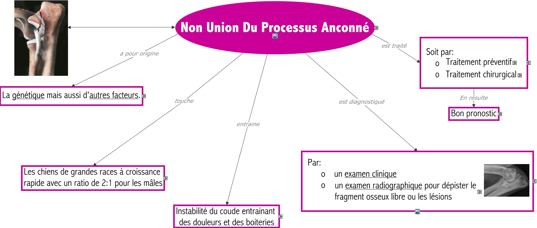Cette carte de concepts créée avec IHMC CmapTools traite de: Non-Union du processus anconné-Camille, Certains chiens de grandes races à croissance rapide dont par ordre décroissant Dogue allemand, Certains chiens de grandes races à croissance rapide dont par ordre décroissant Saint-Bernard, Insatbilité du coude entraîne Inflammation articulaire, Douleur Pouvant évoluer en Dégénerescence arthrosique, Certains chiens de grandes races à croissance rapide dont par ordre décroissant Berger allemand, Traitement chirurgical basé sur Elimination du fragment, Diminution de l'amplitude Pouvant évoluer en Dégénerescence arthrosique, Non Union Du Processus Anconné a pour origine La génétique mais aussi d'autres facteurs., Insatbilité du coude entraîne Diminution de l'amplitude, Traitement préventif en Réduisant l'activitié physique, Boitrerie Pouvant évoluer en Dégénerescence arthrosique, Examen par un lecteur officiel agréé Attribution d'une note: - 0= absence de dysplasie - SL= Stade Limite - 1= dysplasie légère - 2= dysplasie moyenne - 3= dysplasie sévère, Alimentation Non-union du processus anconé, Examen radiographique qui consiste 2 radiographies de profil: - coude en flexion maximale - coude en extension, Boitrerie Pouvant évoluer en Inconfort, Insatbilité du coude entraîne Inconfort, Traitement préventif en Surveillant le poids, Inflammation articulaire Pouvant évoluer en Inconfort, Certains chiens de grandes races à croissance rapide dont par ordre décroissant Pointer, Exercice Non-union du processus anconé